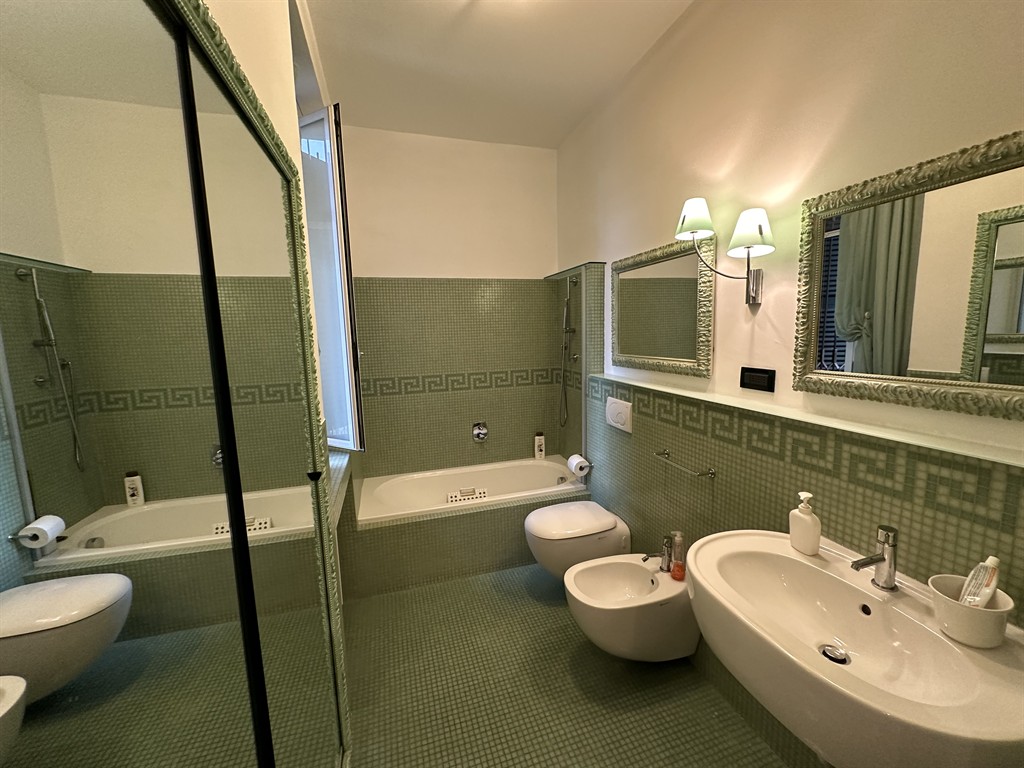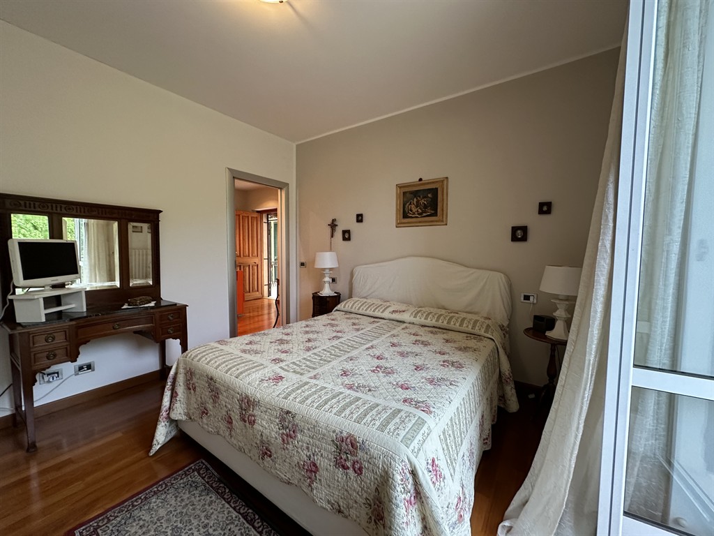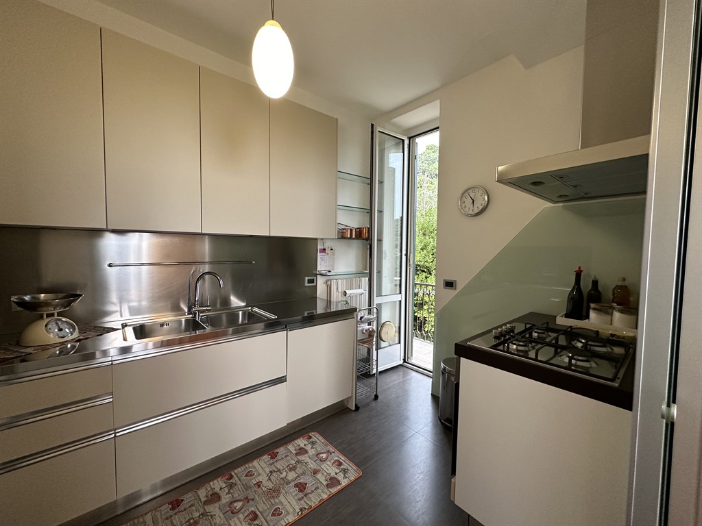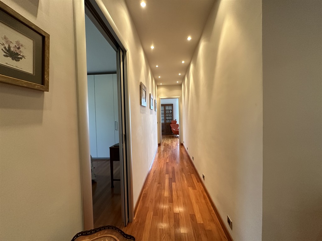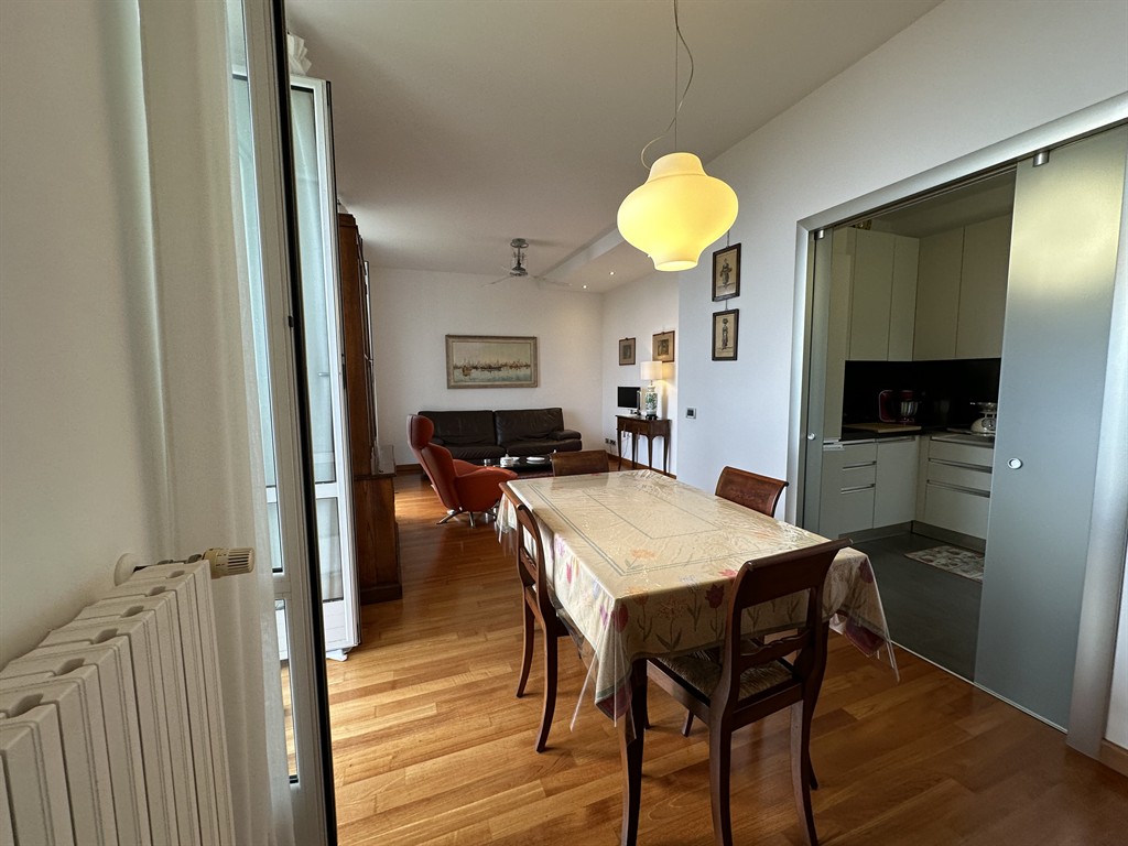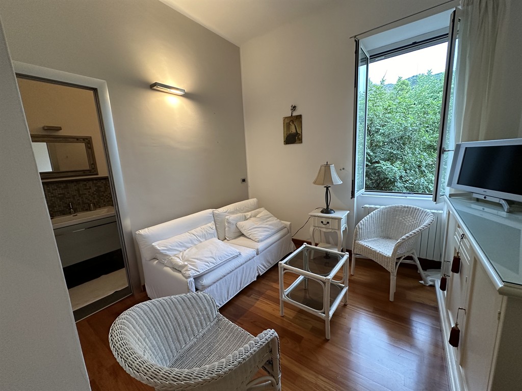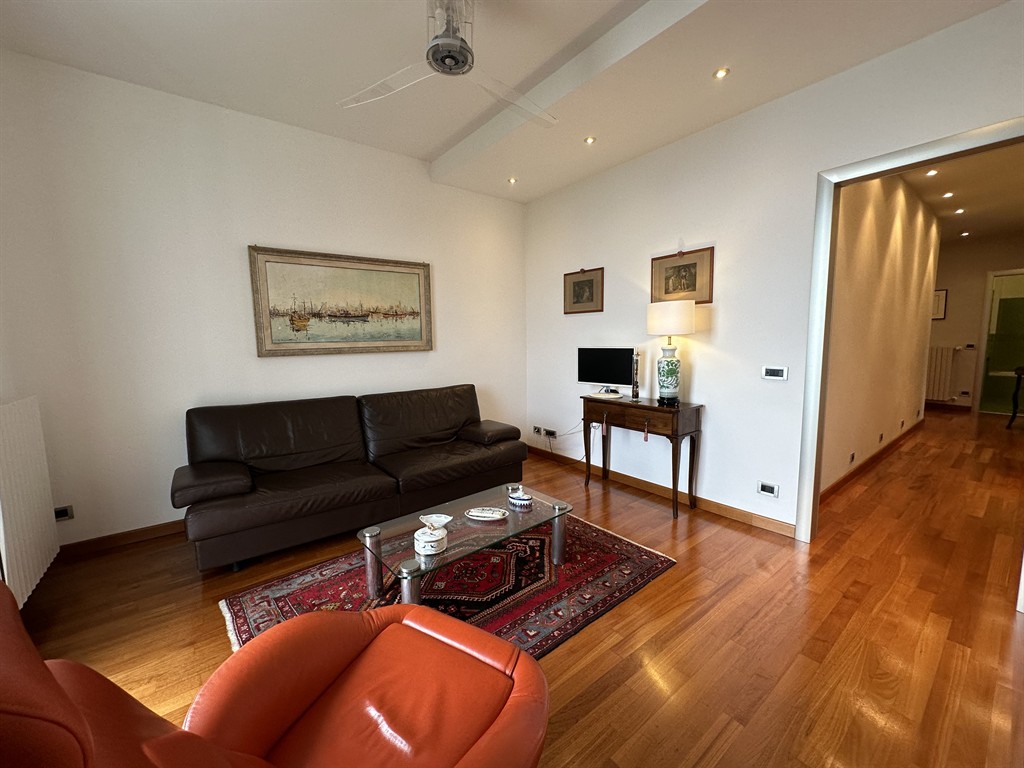 In the splendid setting of Parco Fuor del Vento, at the top of Via Virgilio, we are pleased to present this elegant apartment with a marvelous sea view. A small private courtyard leads to the entrance hall, which opens onto a hallway leading to two bedrooms (one with an en-suite bathroom), a second bathroom, a double living room, and a kitchen. The living area also features two balconies with panoramic views. Parquet flooring, independent heating, partially furnished. Adjacent to the property is a private garden of approximately 200 square meters with a beautiful sea view. The price also includes a 30m2 garage with a mezzanine (200m2), a parking space and a storage room.