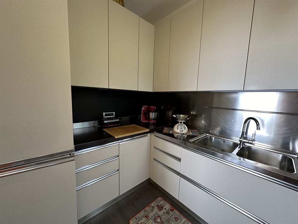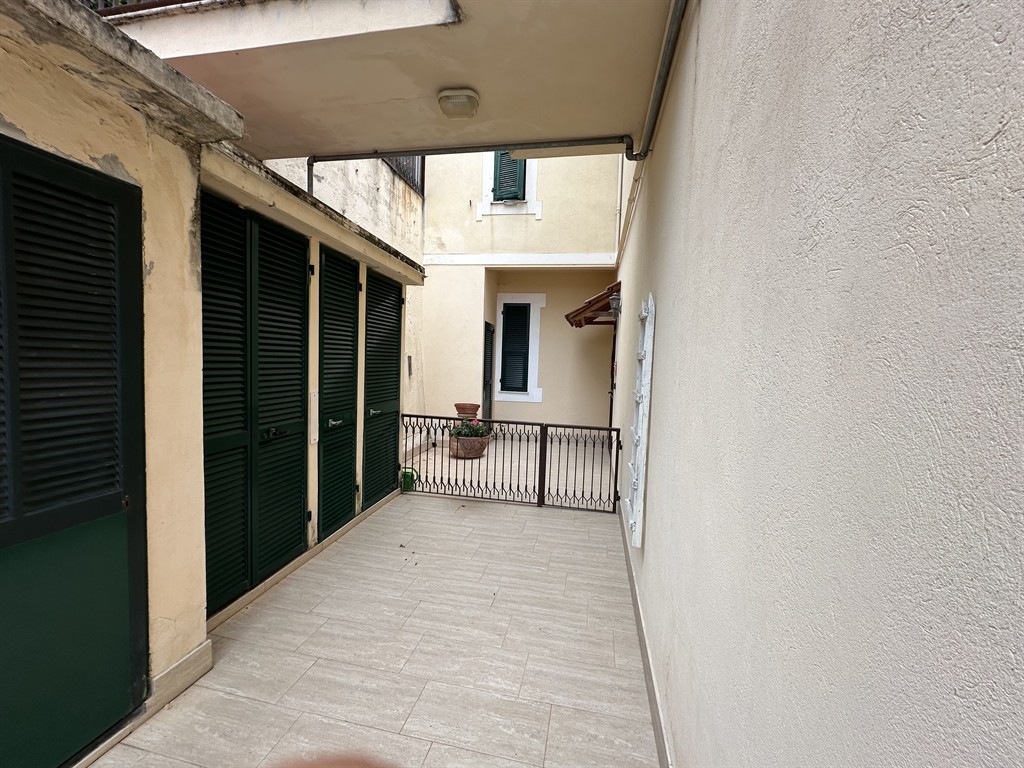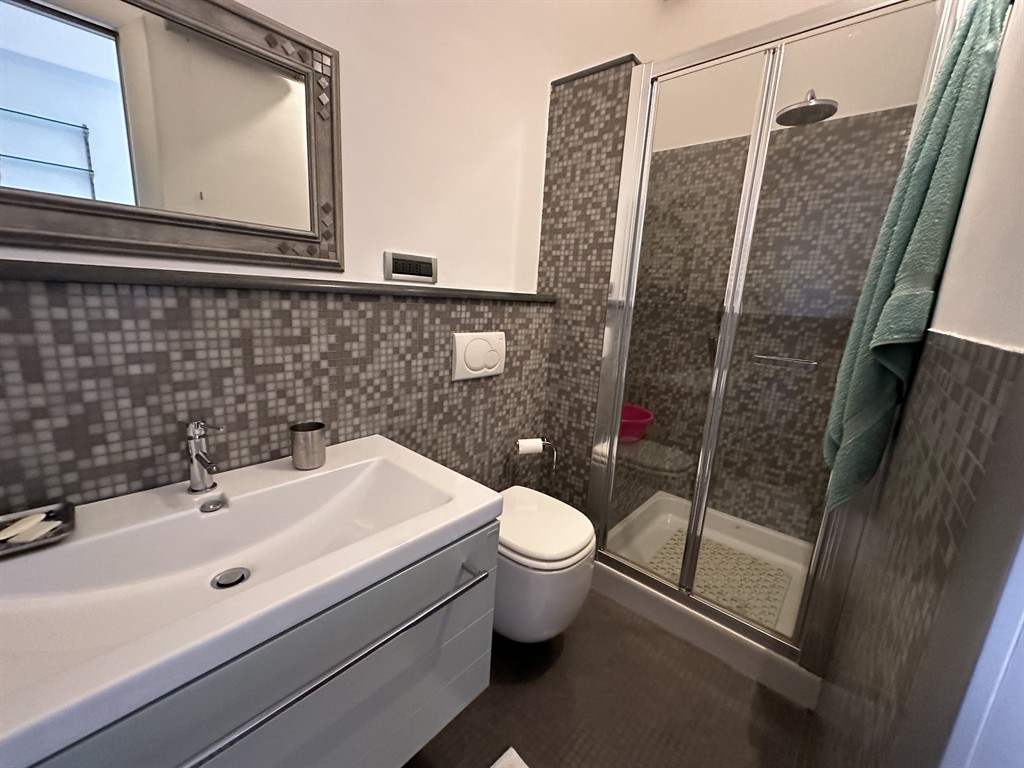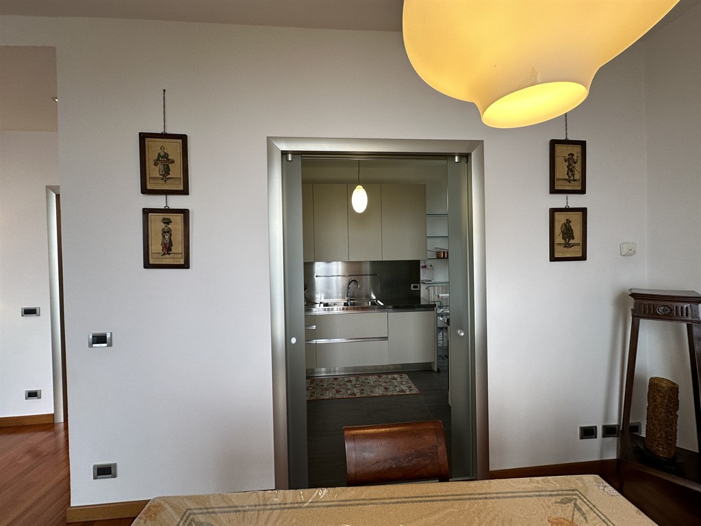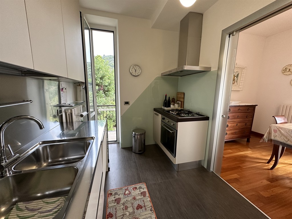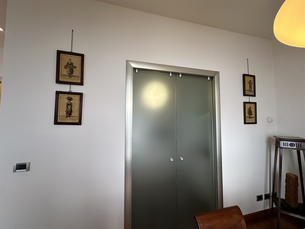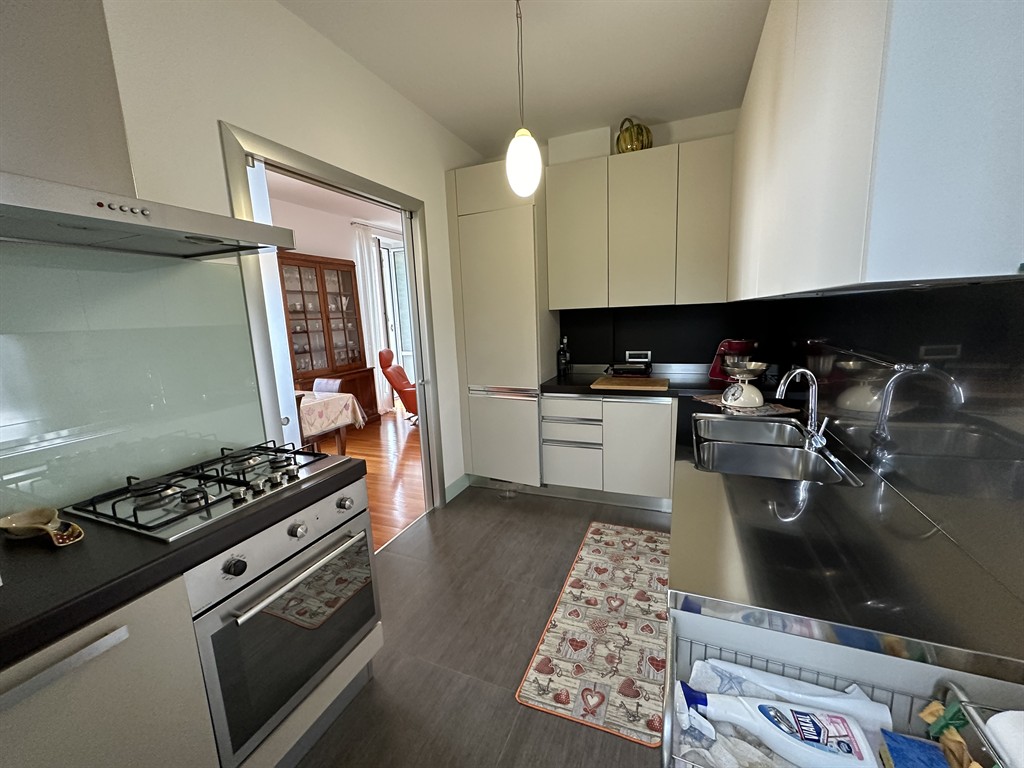 In the splendid setting of Parco Fuor del Vento, at the top of Via Virgilio, we are pleased to present this elegant apartment with a marvelous sea view. A small private courtyard leads to the entrance hall, which opens onto a hallway leading to two bedrooms (one with an en-suite bathroom), a second bathroom, a double living room, and a kitchen. The living area also features two balconies with panoramic views. Parquet flooring, independent heating, partially furnished. Adjacent to the property is a private garden of approximately 200 square meters with a beautiful sea view. The price also includes a 30m2 garage with a mezzanine (200m2), a parking space and a storage room.