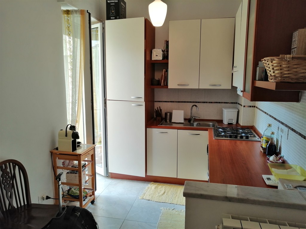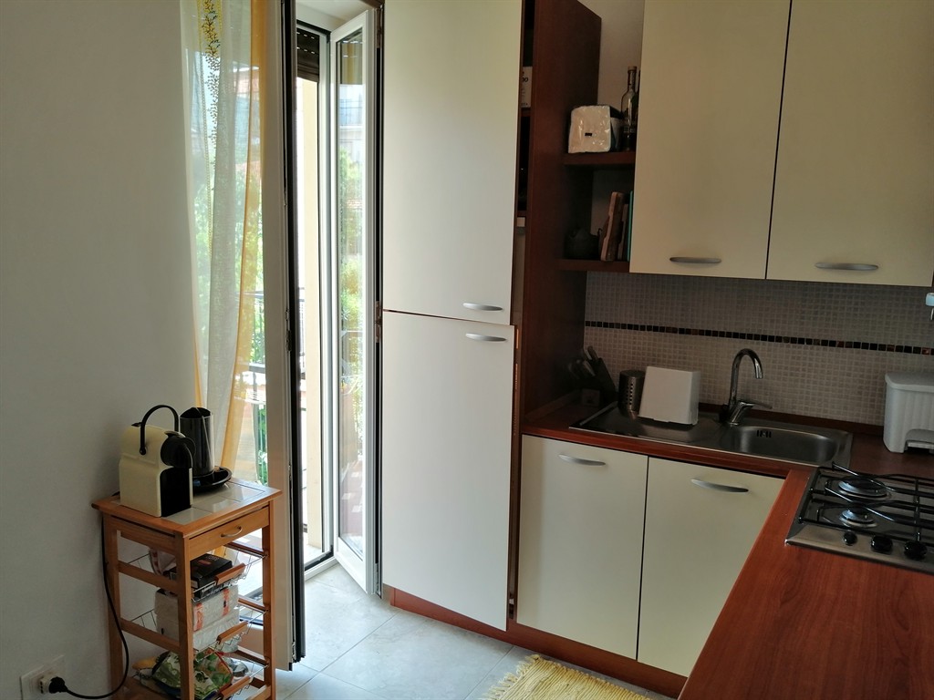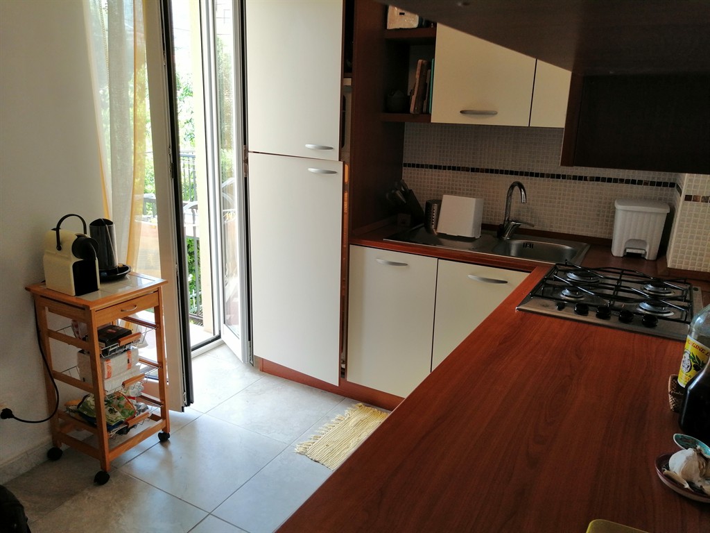 In a small building on the first floor with an elevator, this renovated apartment features new fixtures, floors, and windows. It comprises a living room with kitchenette, two double bedrooms, a bathroom with window, two balconies, and a storage room. A nearby garage is available for rent. Ideal as a vacation home, close to the sea and convenient to all amenities.