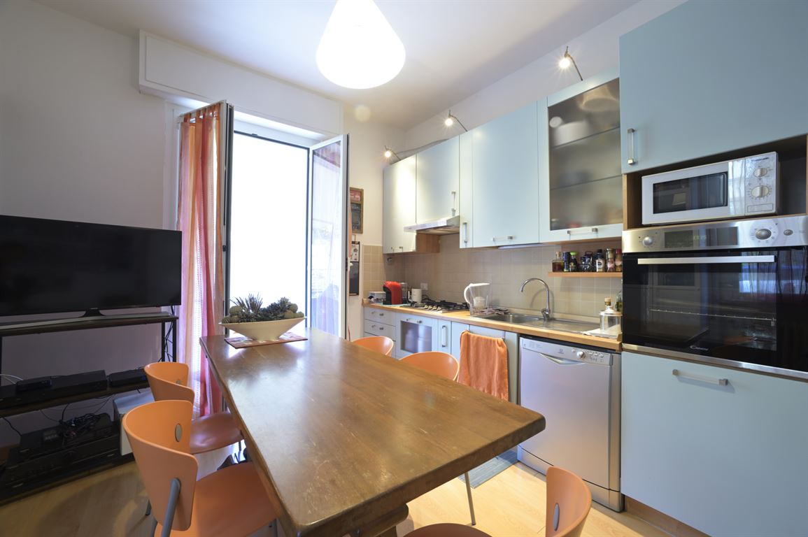 We are pleased to offer for sale in the San Rocco area, this three-room apartment with a spacious balcony. The apartment comprises an entrance hallway, a living room with kitchenette and balcony, two large double bedrooms, a bathroom with window, and a closet. This very convenient and quiet location allows you to easily walk around Alassio without needing any transportation. This recently renovated apartment is sunny, has independent heating, and has no condo fees. It's a great location close to schools, the tennis court, and the Alassio swimming pool.