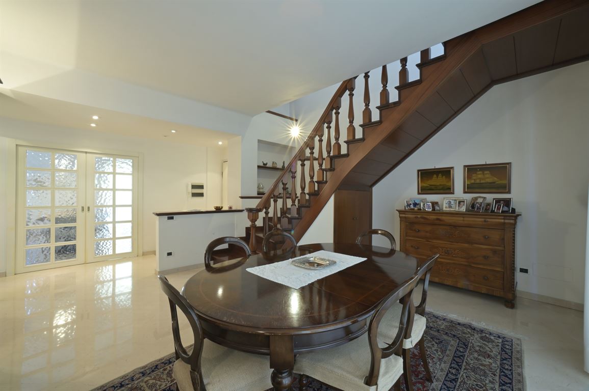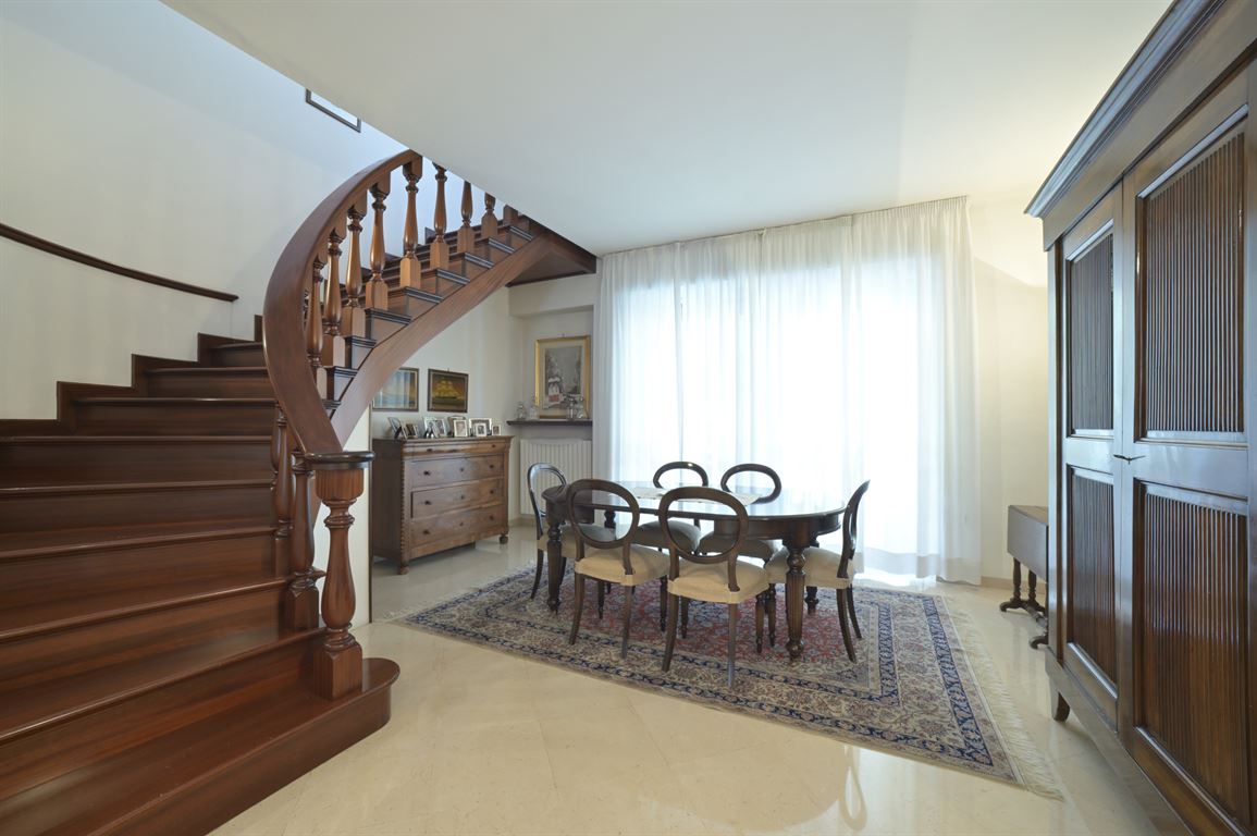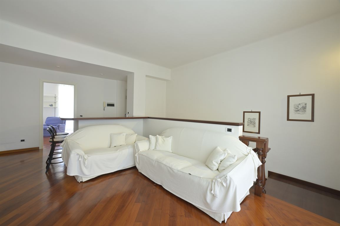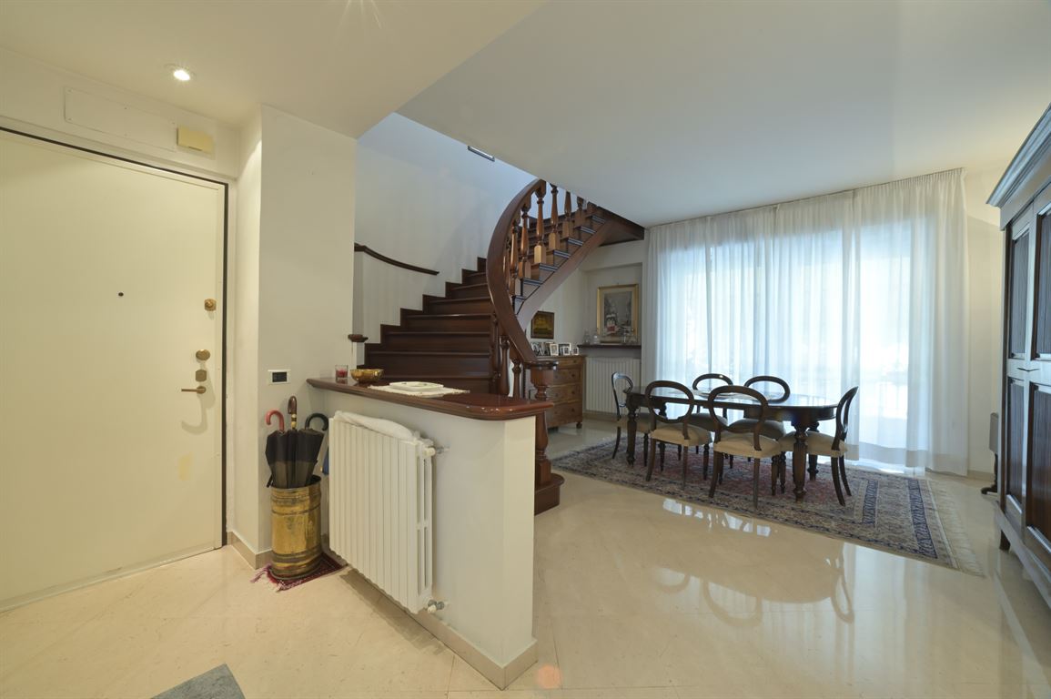 We offer for exclusive sale an elegant, centrally located apartment with a generous floor area of 235 square meters spread over two levels connected by a magnificent solid wood staircase. The building was recently renovated, with a roof redone about 18 years ago, and is served by an elevator. Two cellars are exclusive to the apartment. On the first floor (2nd above ground) is an entrance hall leading to a bright living room, a spacious eat-in kitchen, a large bathroom with window, a half bathroom, two bedrooms, a study, and two balconies. Upstairs is a spacious living room, two large double bedrooms, a third single bedroom, a large bathroom, and two balconies. Fine marble and mosaic flooring on the first floor and parquet throughout the second floor. State-of-the-art fixtures. Suitable for both residential and vacation rentals. Excellent location!
