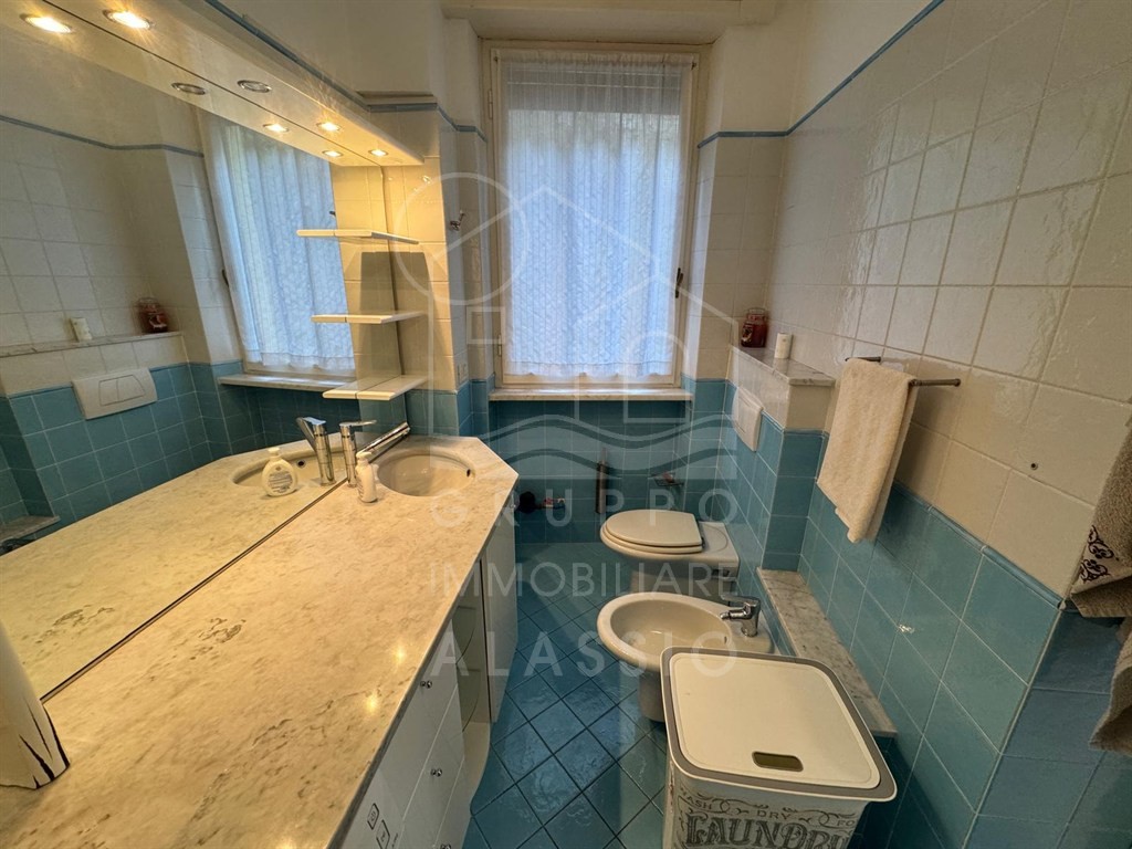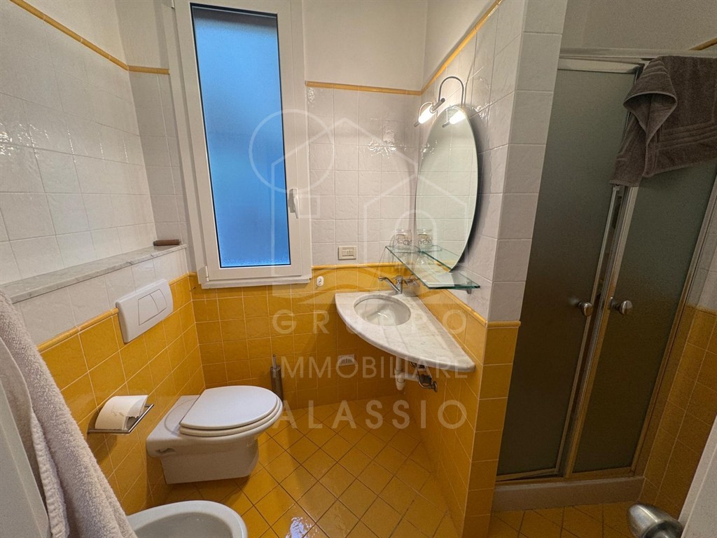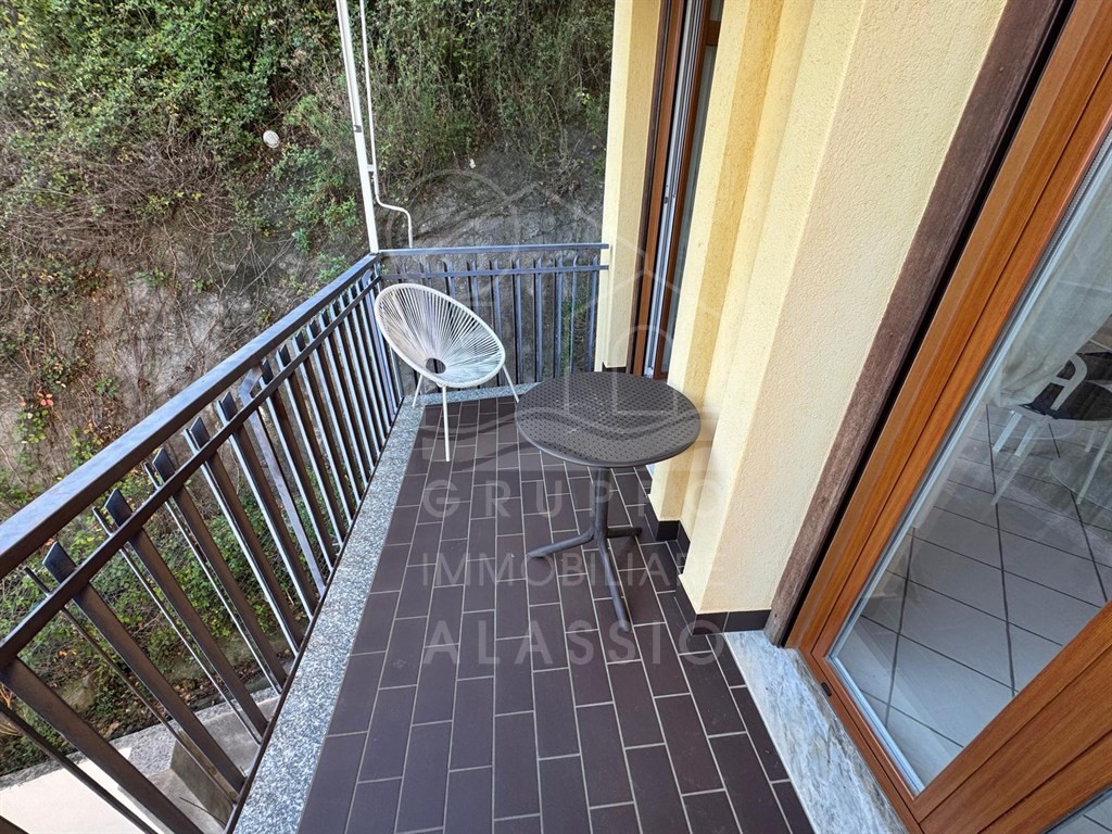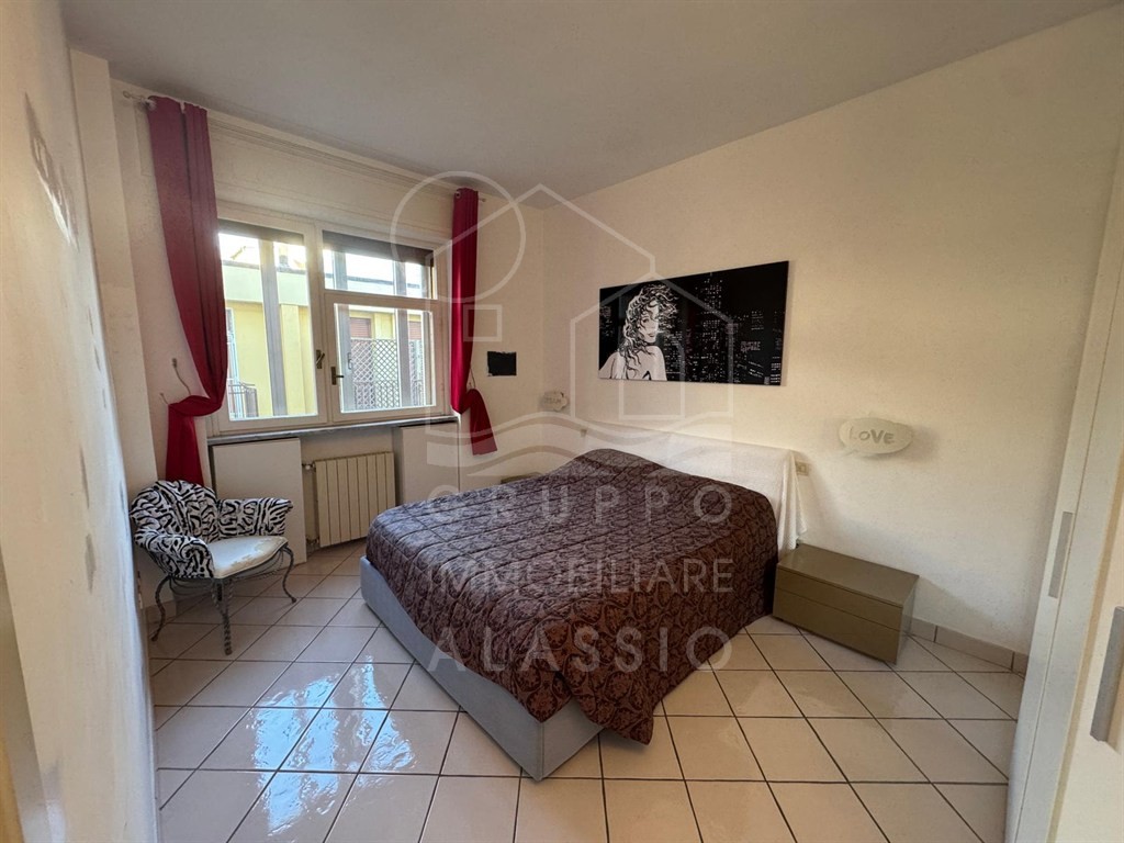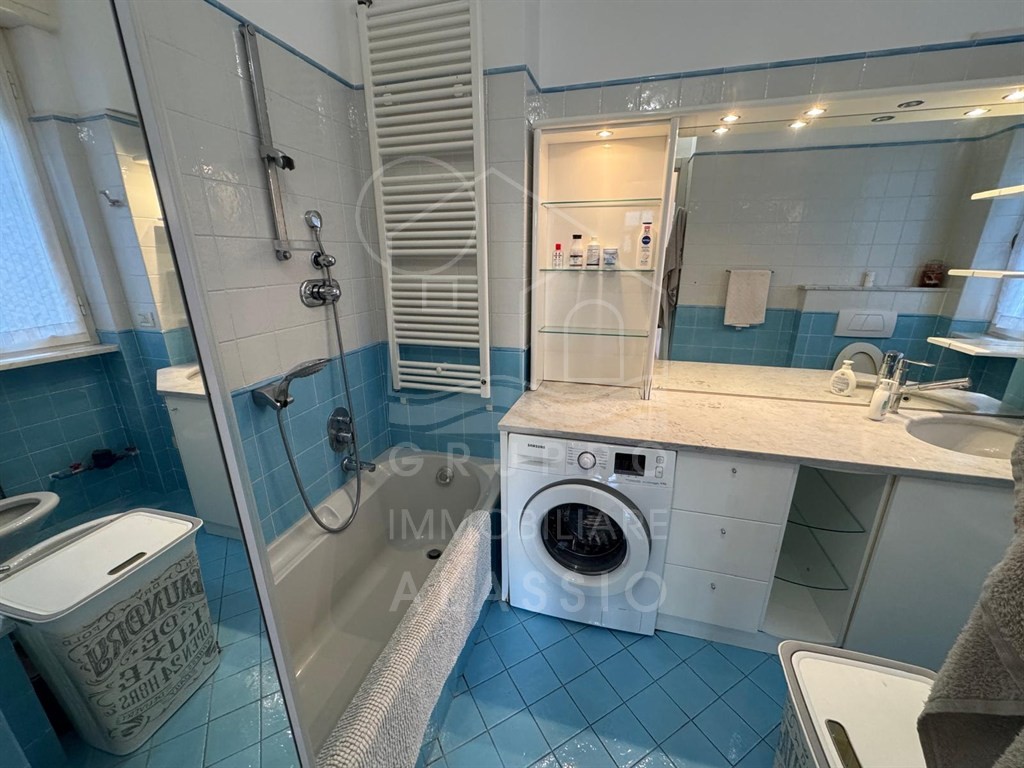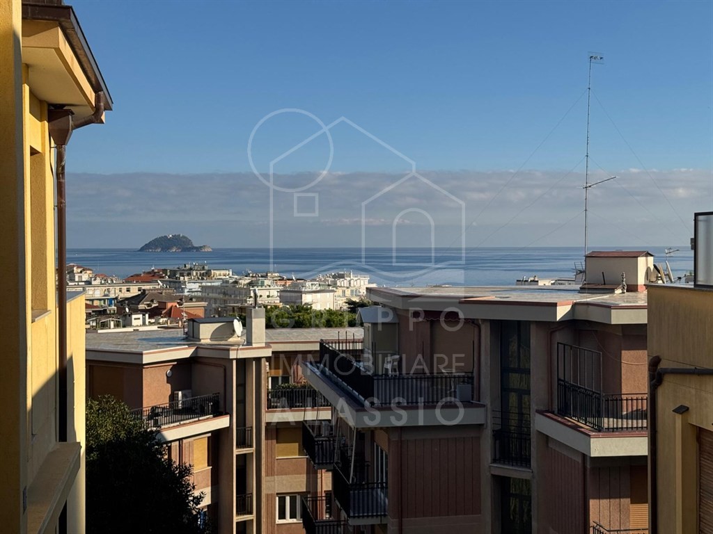 Alassio, conveniently located near the sea, renovated three-room apartment on the top floor with elevator. The apartment comprises a living room with kitchenette, double bedroom, single bedroom, two bathrooms, and a balcony with sea views.
