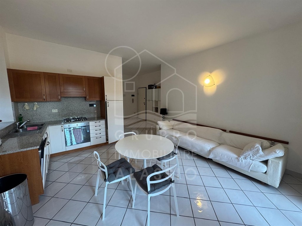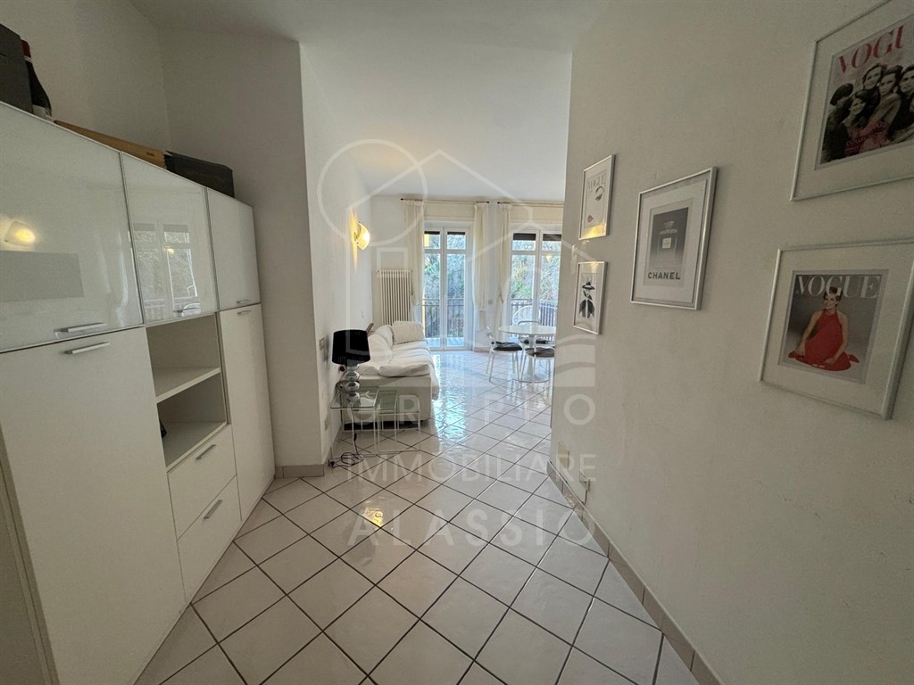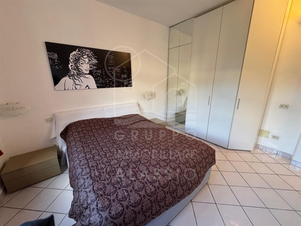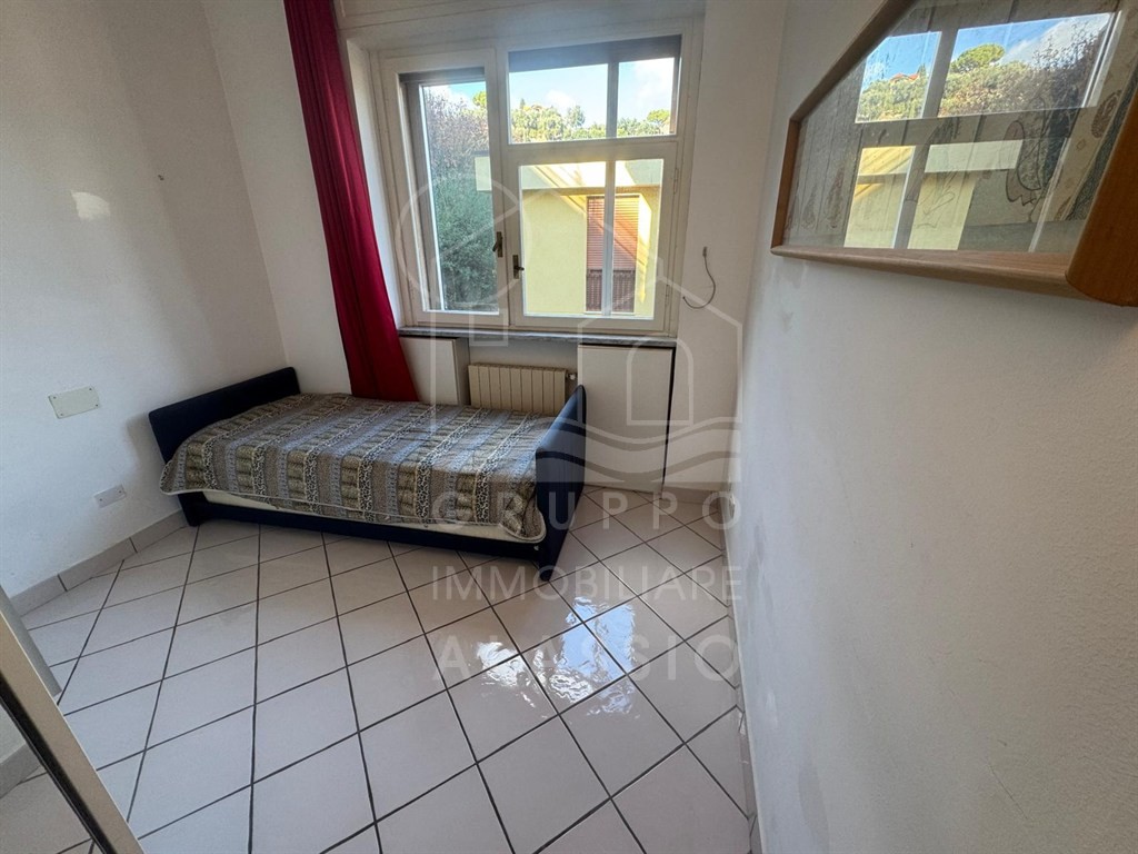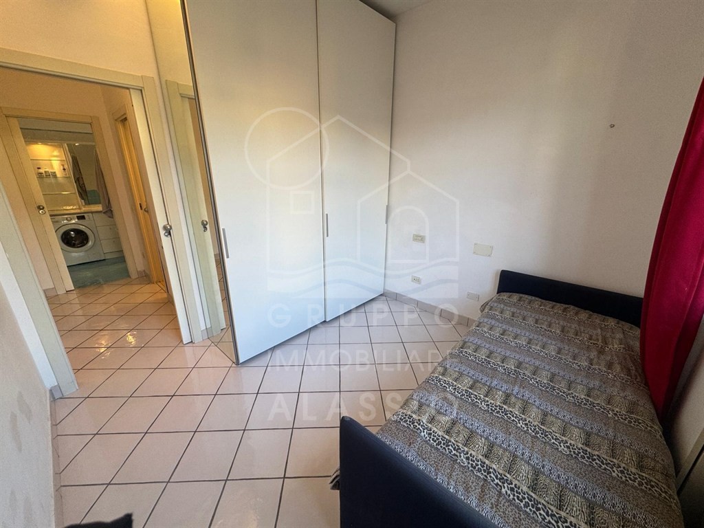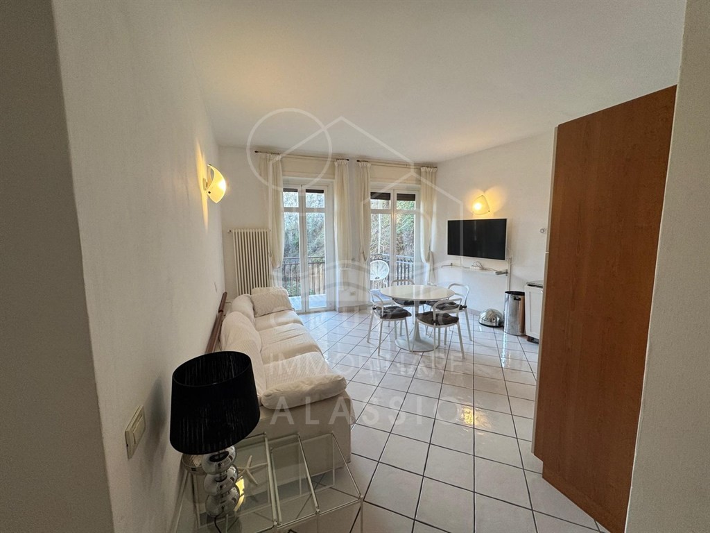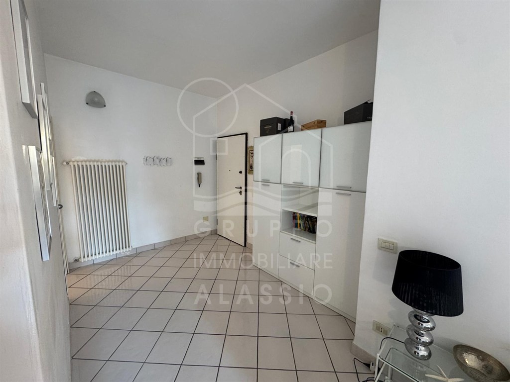 Alassio, conveniently located near the sea, renovated three-room apartment on the top floor with elevator. The apartment comprises a living room with kitchenette, double bedroom, single bedroom, two bathrooms, and a balcony with sea views.
