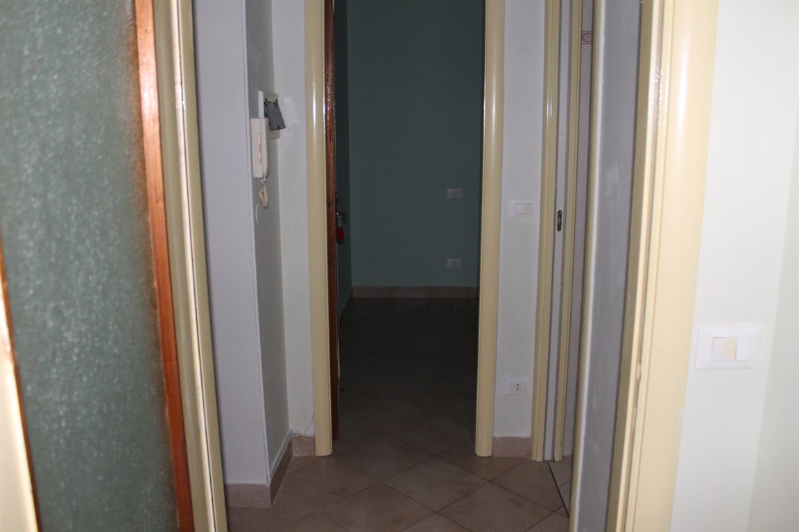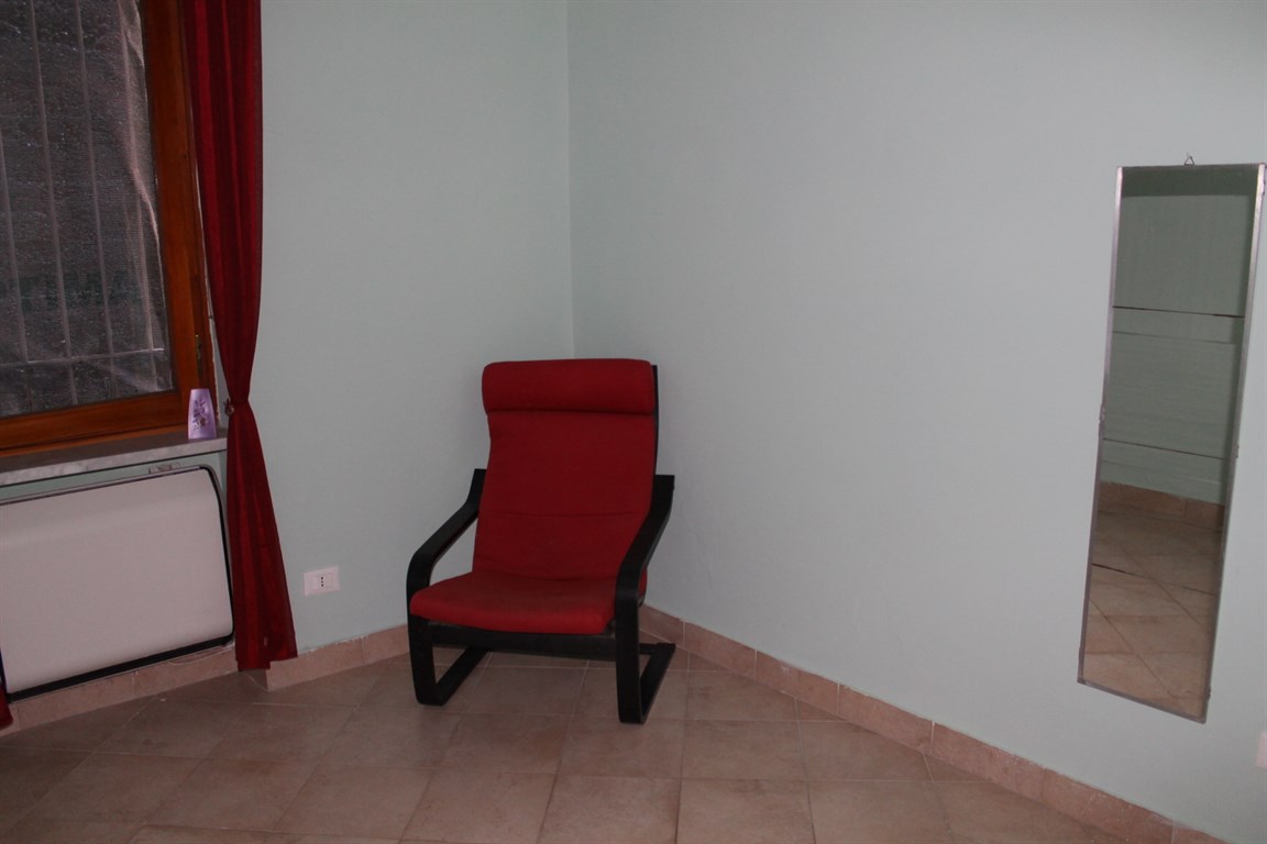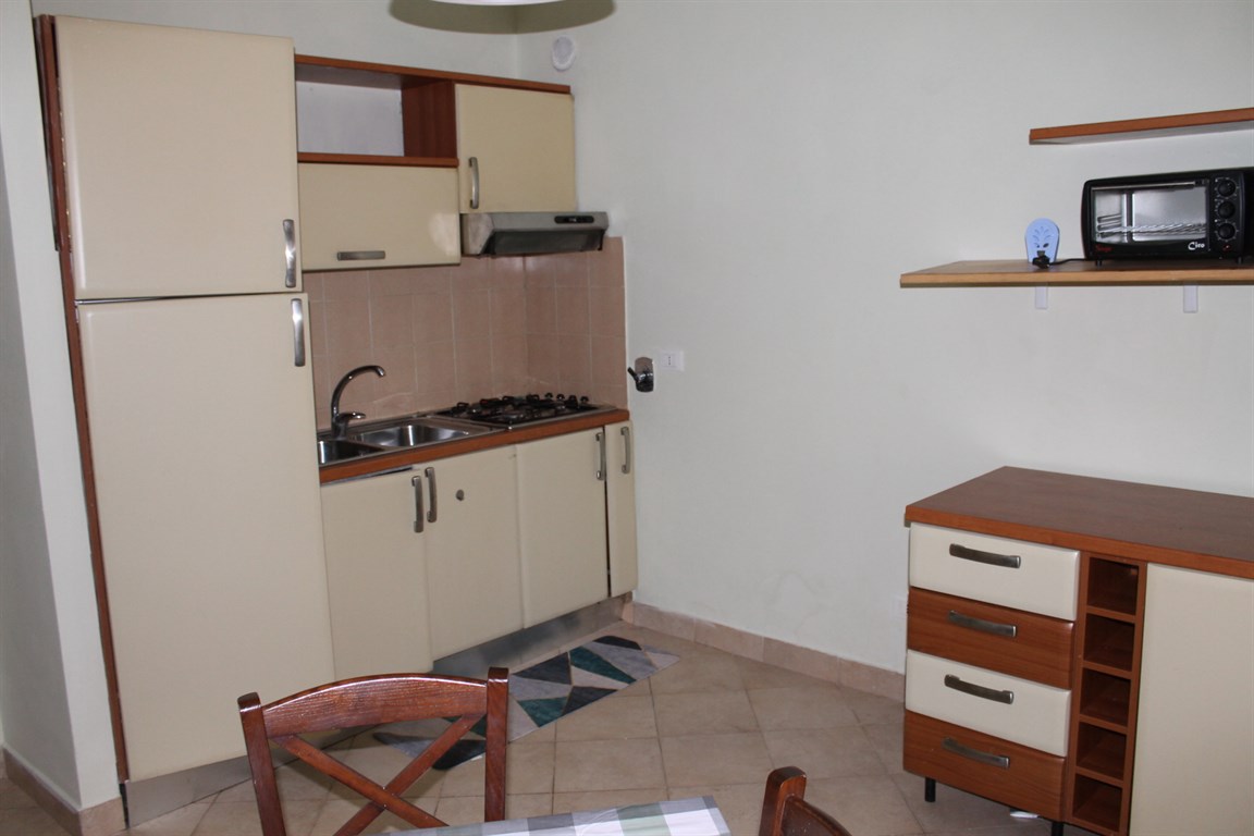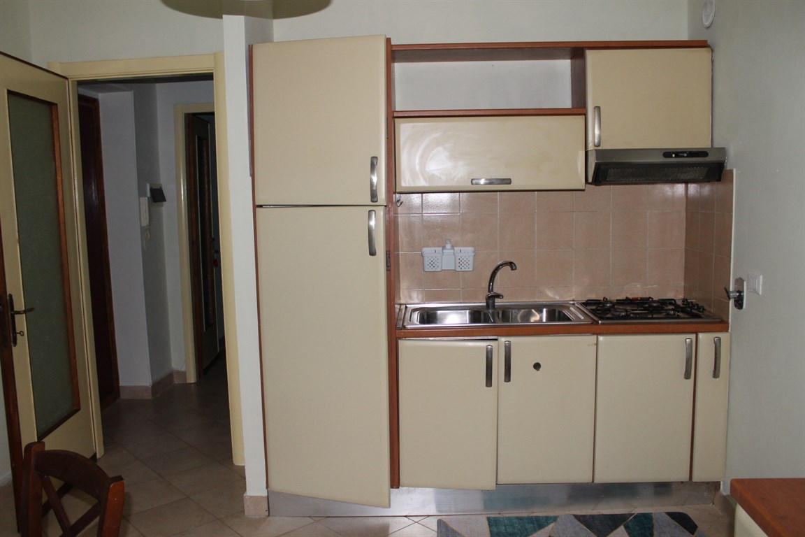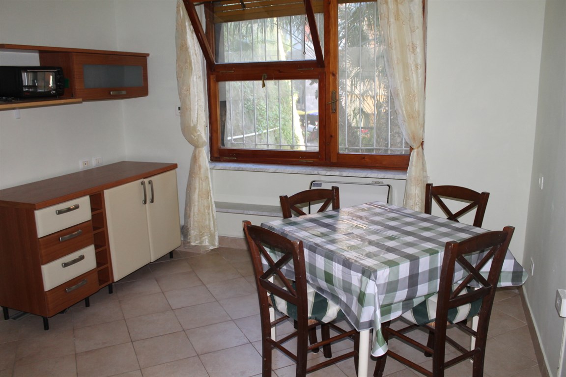 Alassio, near Villa Pergola, a two-room ground floor apartment requiring renovation. It features a small outdoor space and access to the roof terrace. It comprises a living room with kitchenette, double bedroom, bathroom, and independent heating.