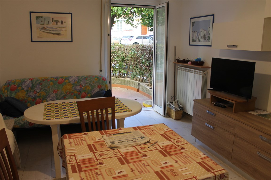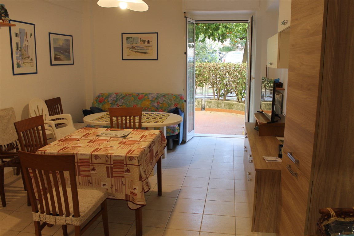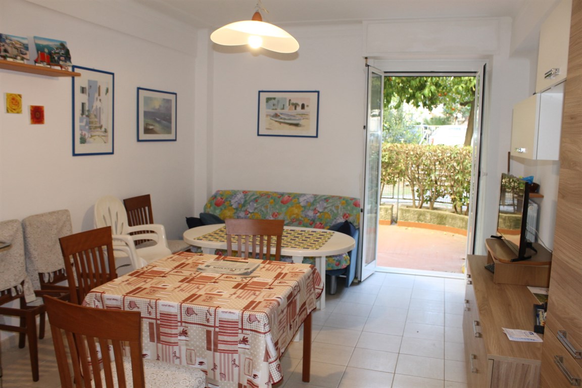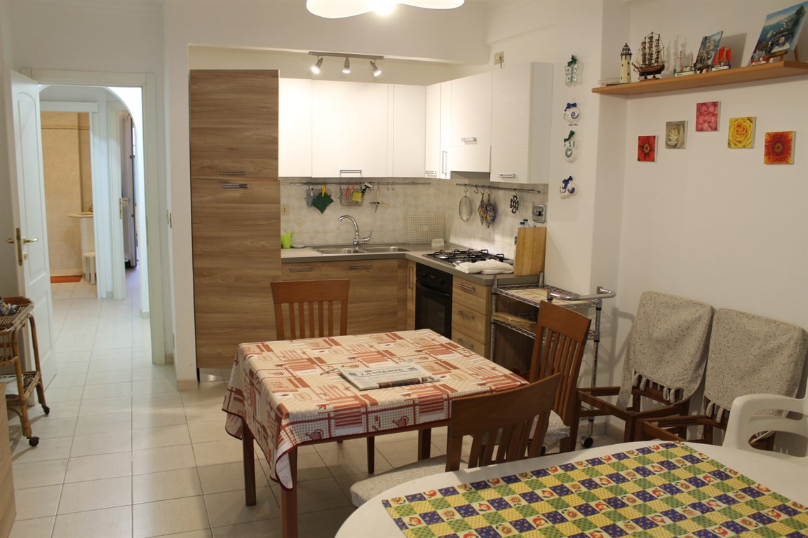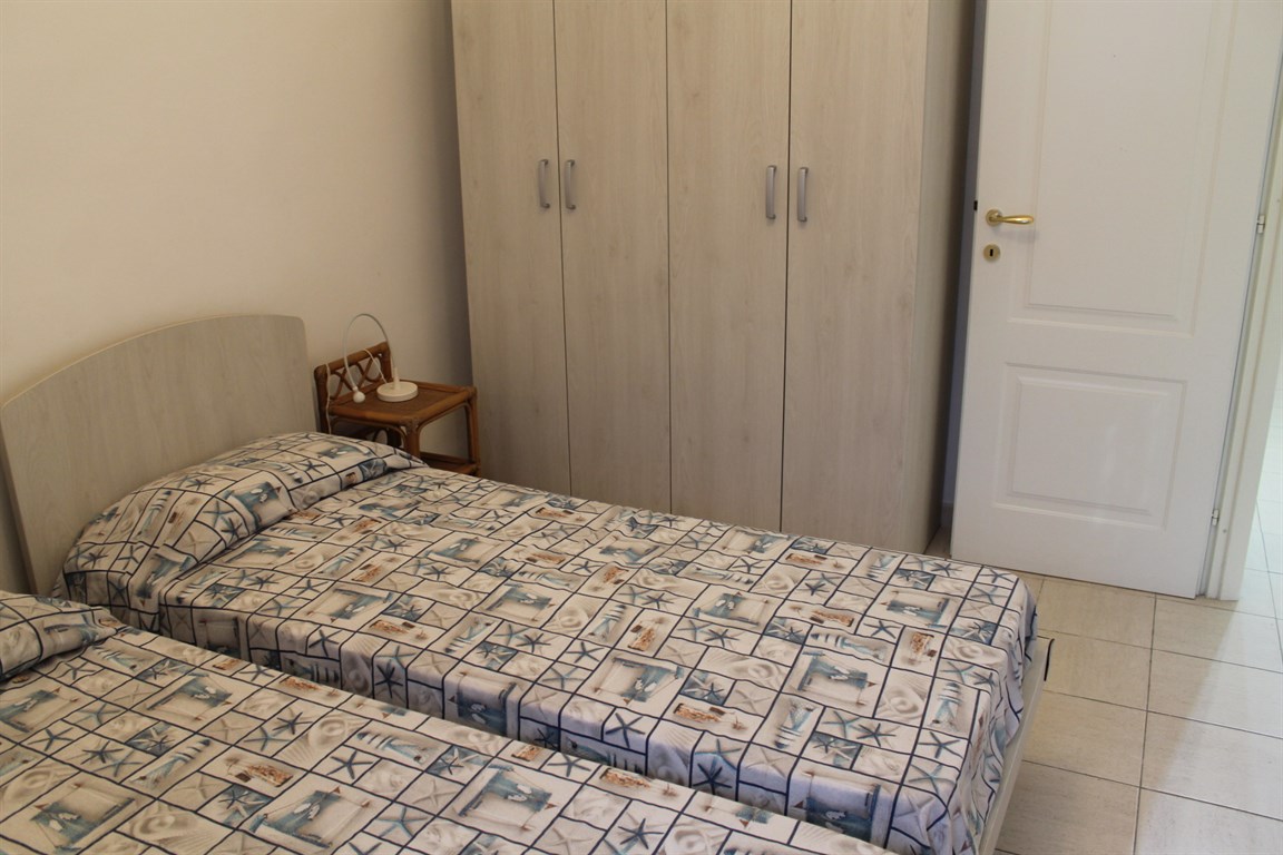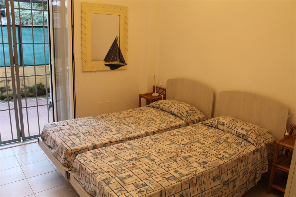 A few steps from the sea, a three-room apartment with two outdoor spaces, comprising a living room with kitchenette, two bedrooms, a bathroom, and a closet.