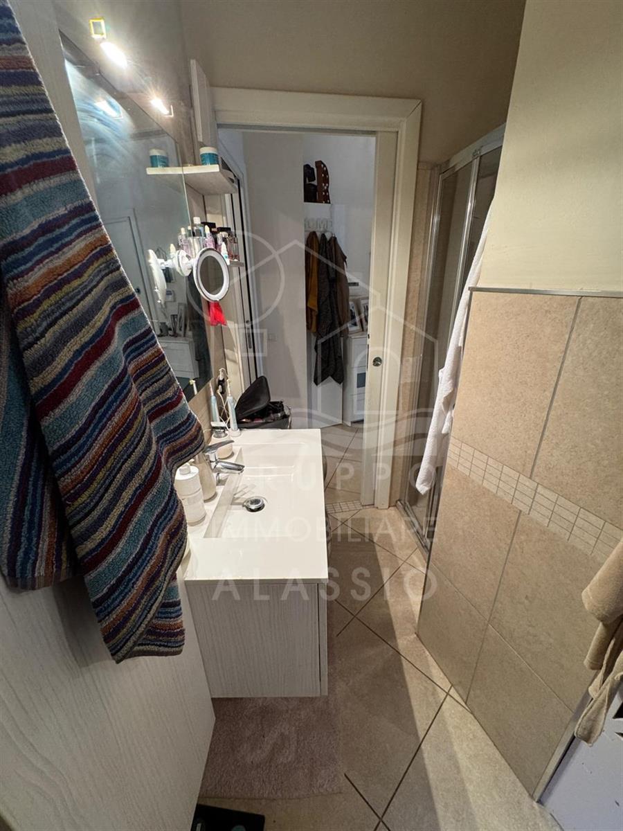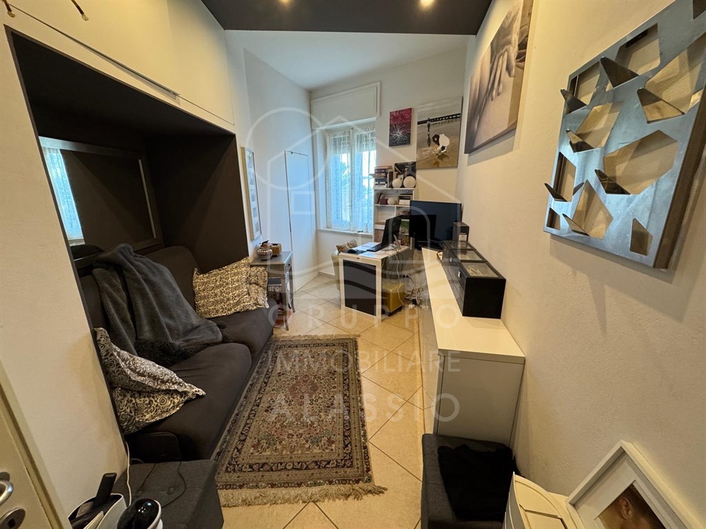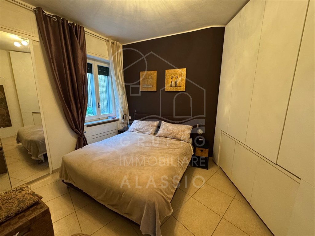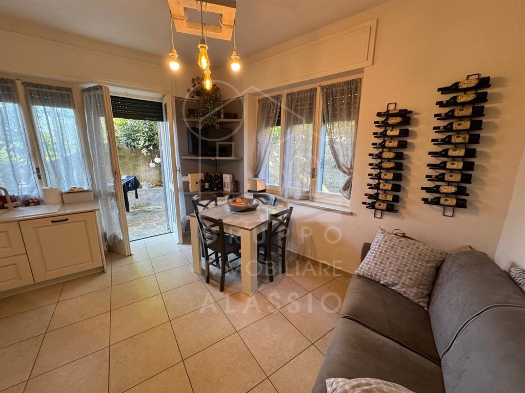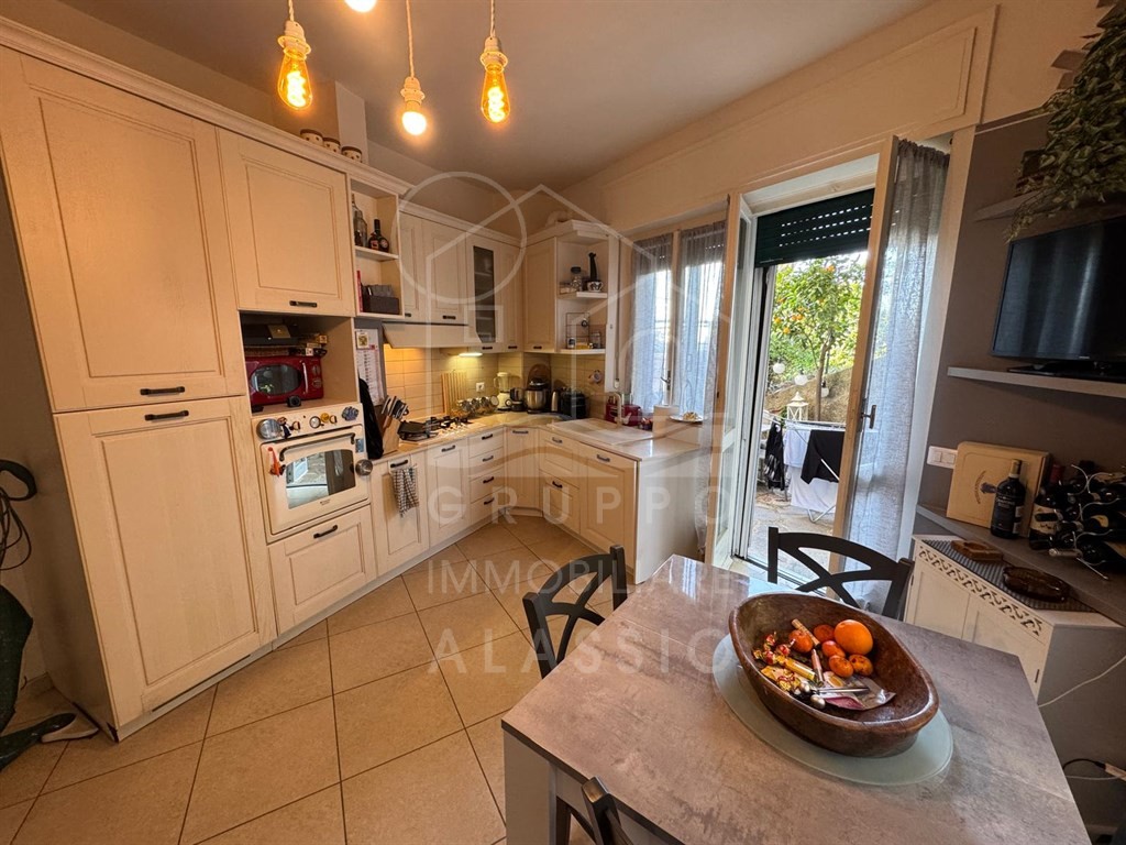 Alassio, on the first hill, a small, renovated three-room apartment with a sea-view terrace and private garden. The apartment comprises an entrance hall, eat-in kitchen, two bedrooms, a bathroom, and a closet. Independent heating and air conditioning are included.