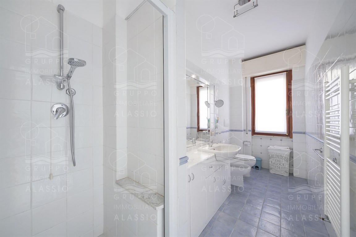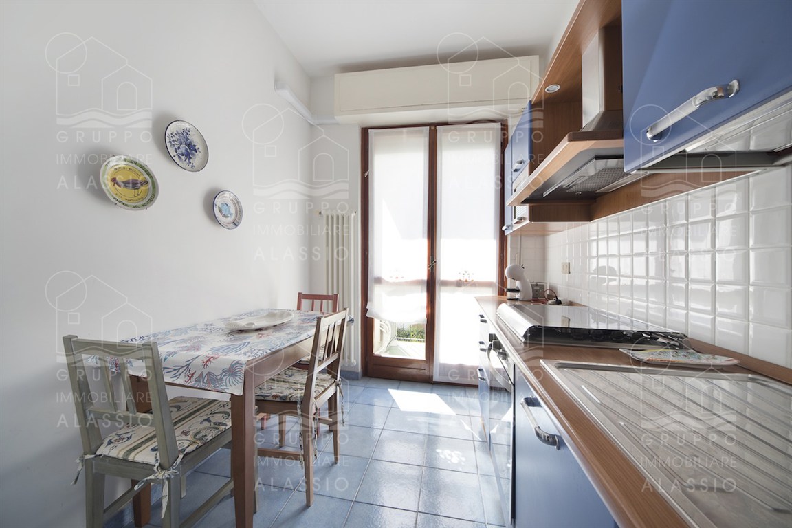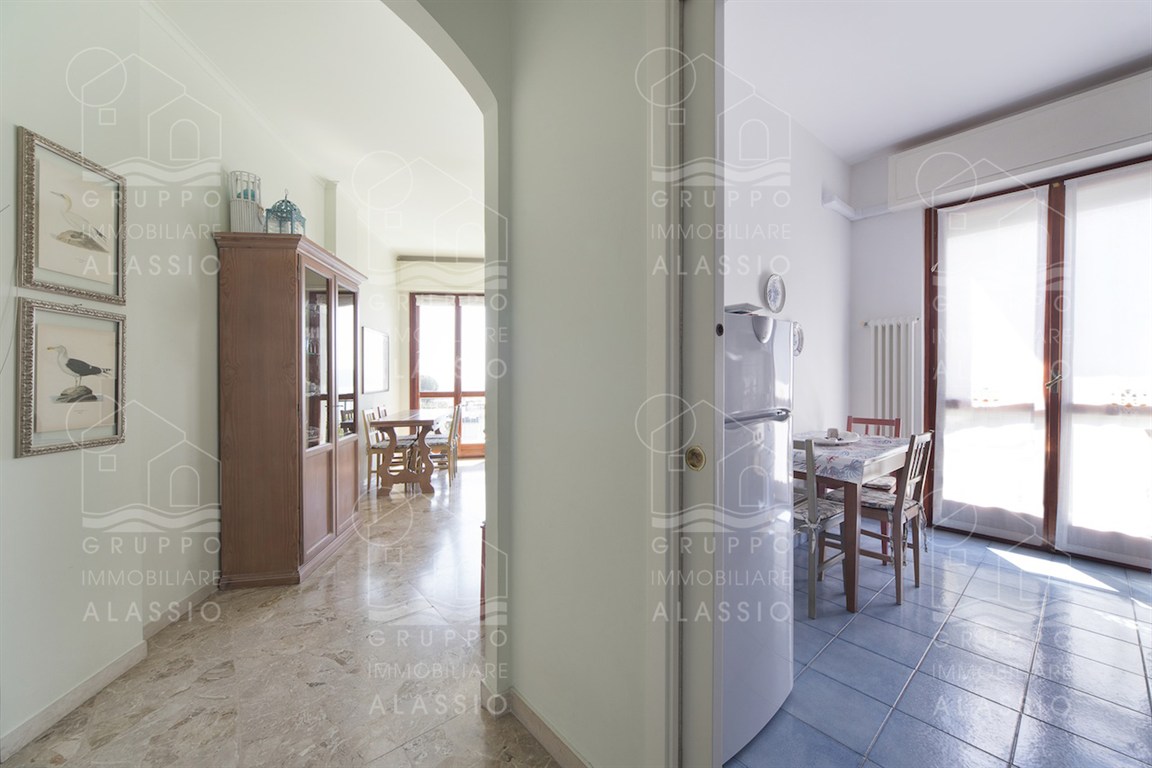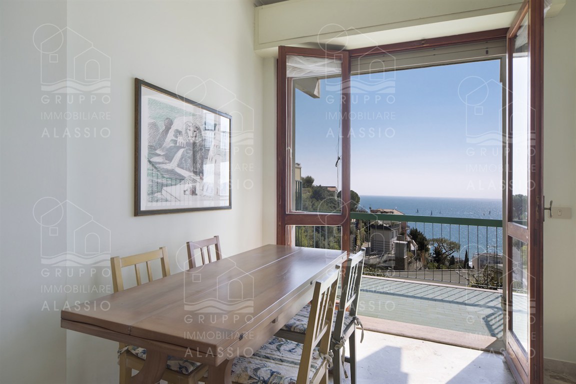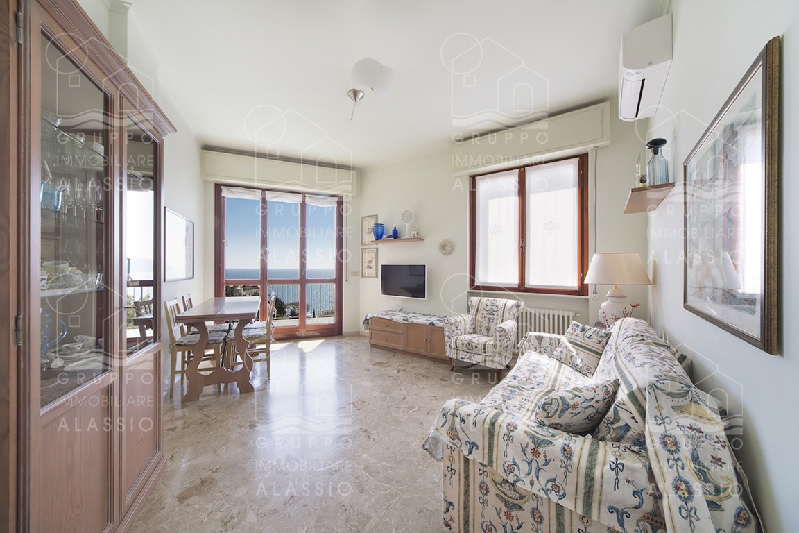 In the Solva area of Alassio, we offer a bright apartment with two balconies overlooking the sea. The apartment comprises an entrance hall with custom-made furniture, two double bedrooms, a large bathroom with a window, an eat-in kitchen with a balcony, a living room with a sea-view balcony, and a closet. A large two-car garage is available for purchase near the apartment. Asking price €410,000