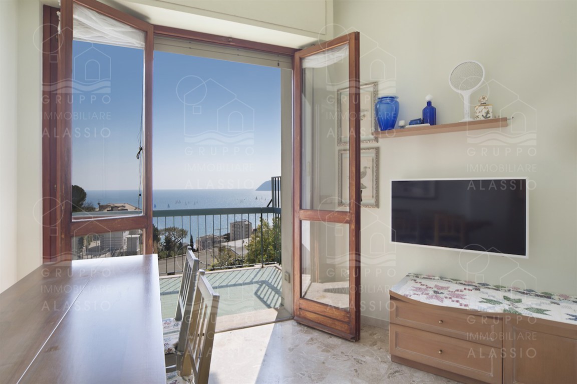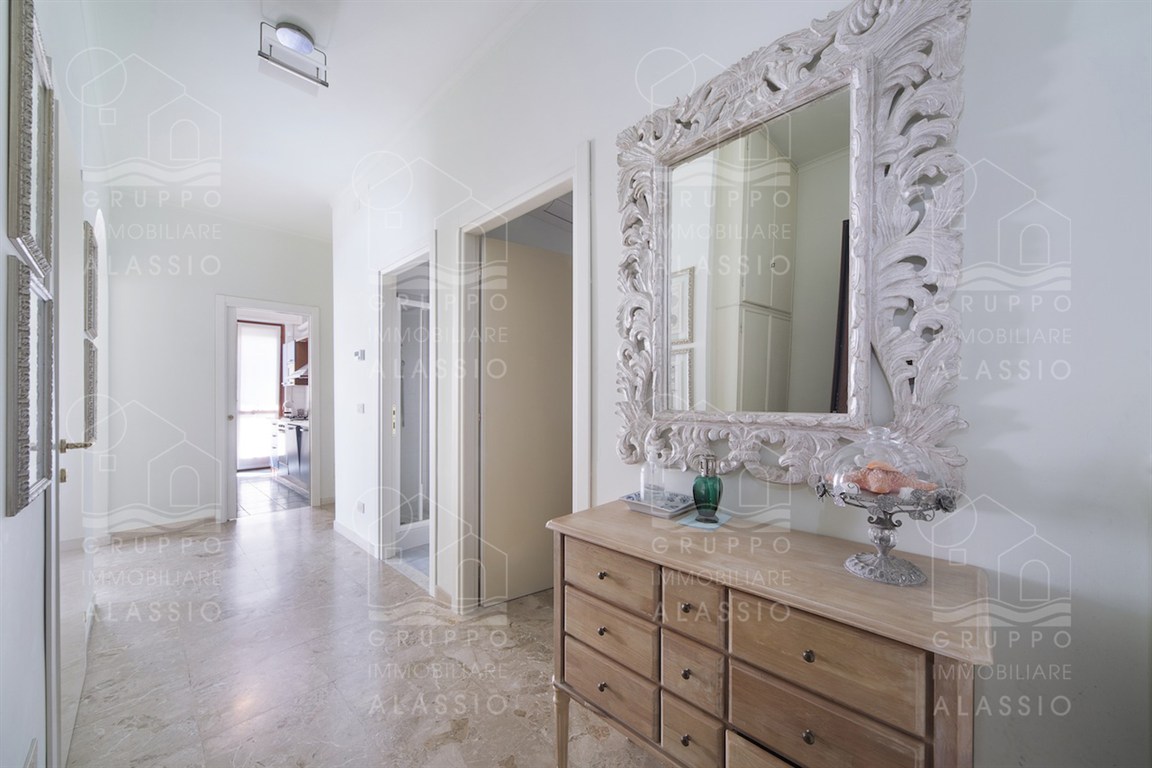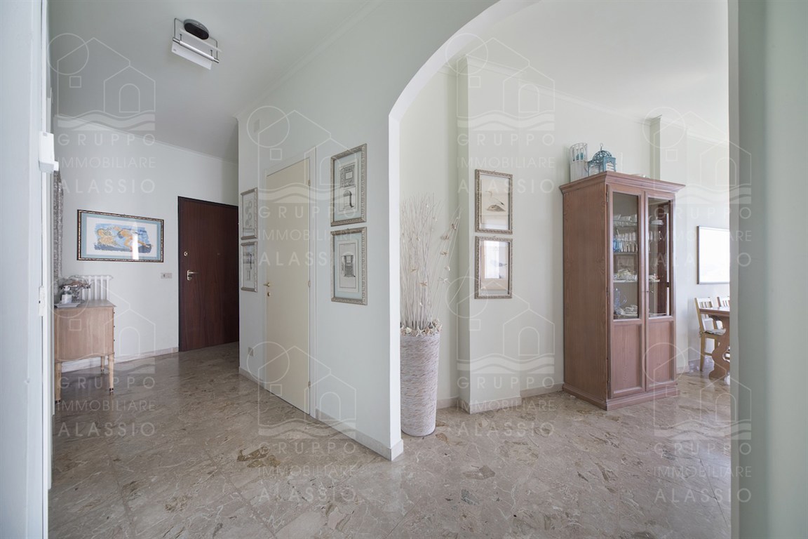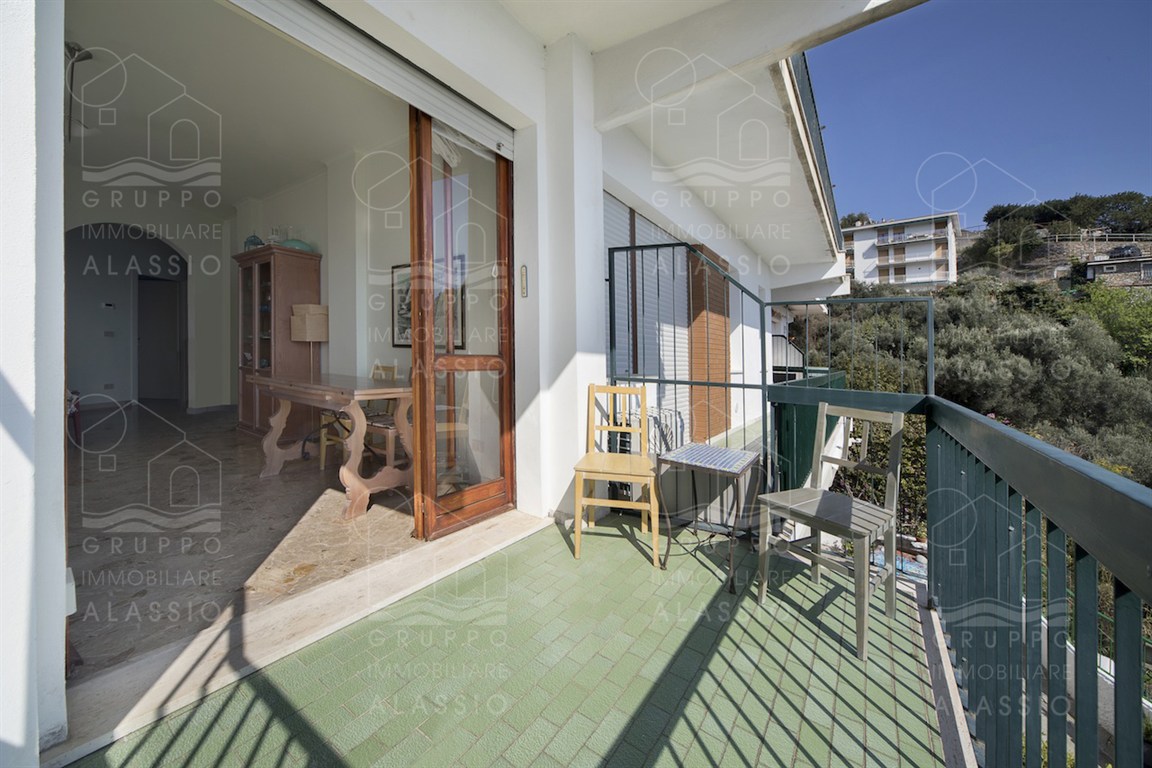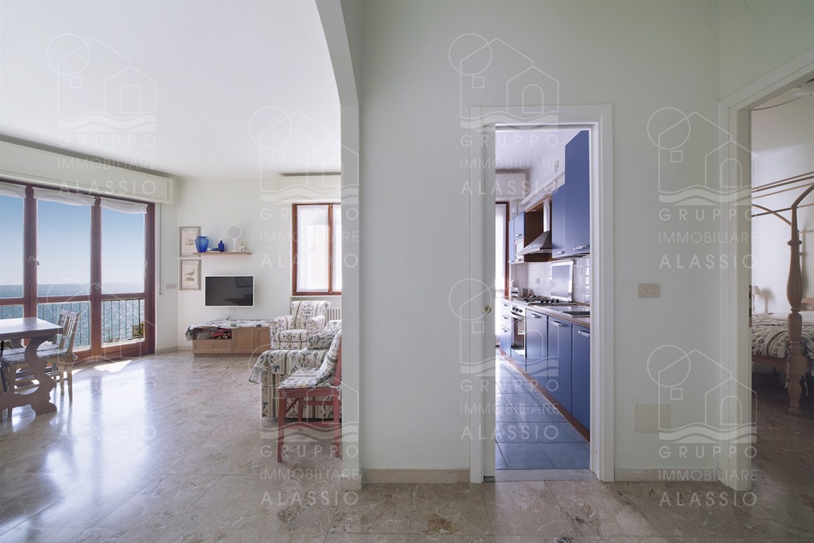 In the Solva area of Alassio, we offer a bright apartment with two balconies overlooking the sea. The apartment comprises an entrance hall with custom-made furniture, two double bedrooms, a large bathroom with a window, an eat-in kitchen with a balcony, a living room with a sea-view balcony, and a closet. A large two-car garage is available for purchase near the apartment. Asking price €410,000