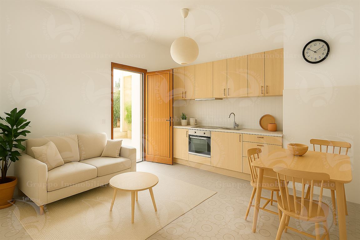 Alassio – In a flat area just 500 meters from the center and the beaches, we offer for sale a two-room apartment with ample outdoor space and parking. Completely to be renovated. The apartment is composed of: - living room with kitchenette, - bedroom, - bathroom with window, - large covered courtyard/terrace with double access, both pedestrian and vehicular. Ideal solution for those seeking a customizable home with livable outdoor spaces, in a convenient and well-served location. The images are renderings that show the apartment's potential; the property is in need of complete renovation.
