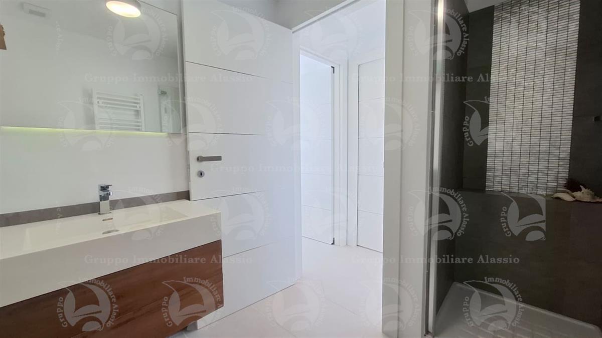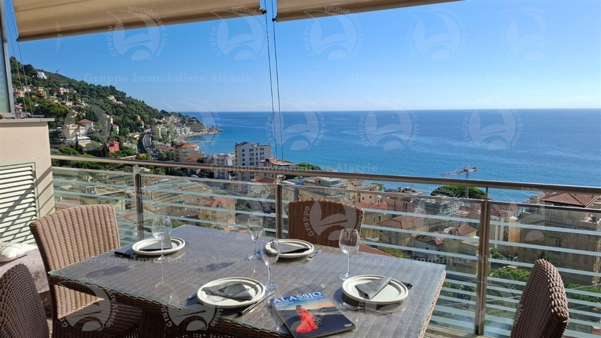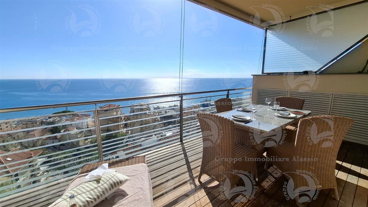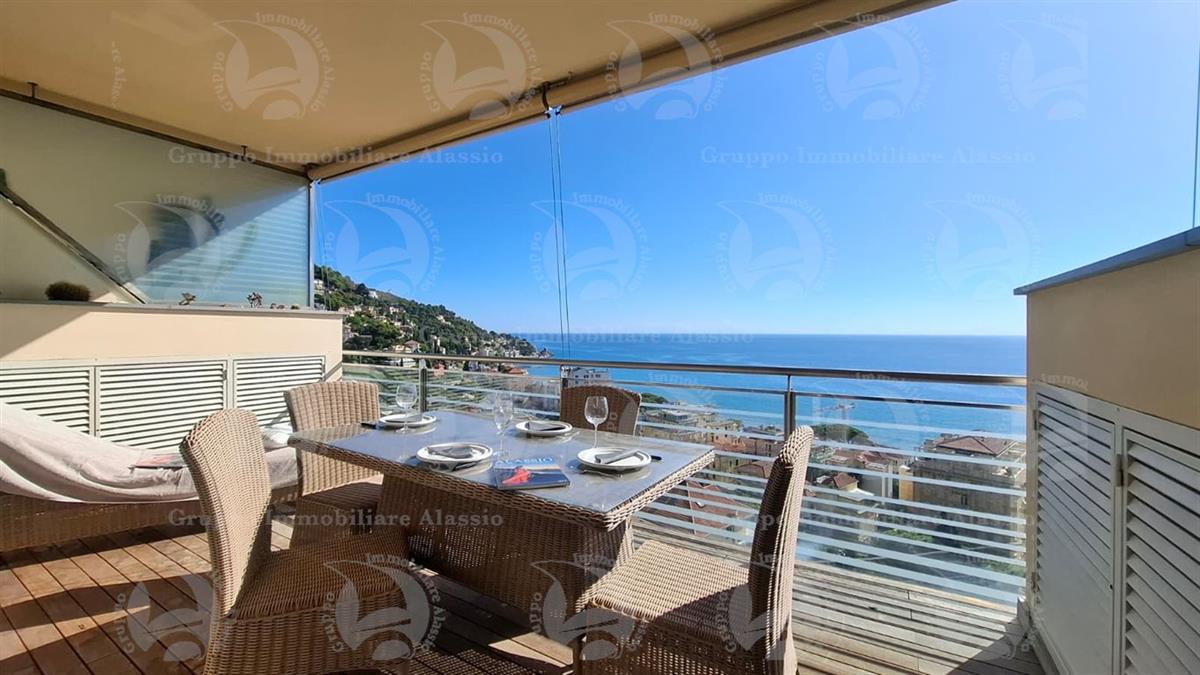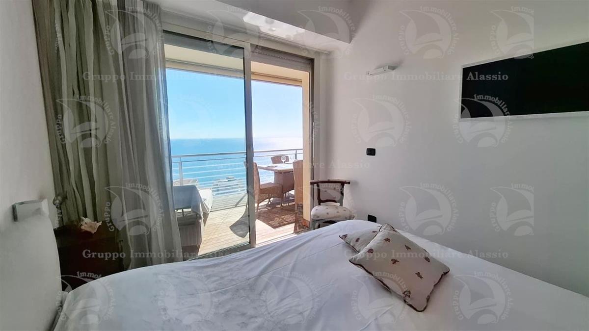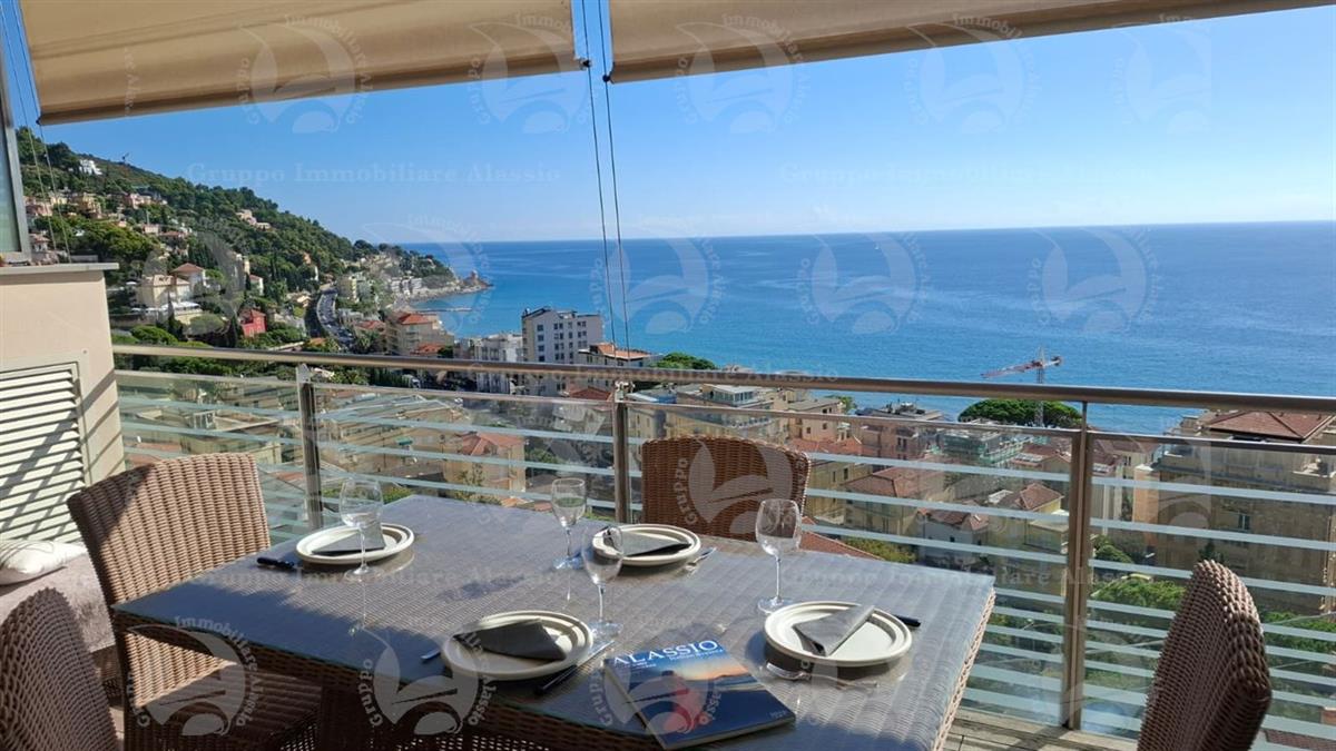 Alassio, on the very first eastern hill, we offer this exclusive two-room apartment with sea-view windows and a large terrace. The apartment is located in an exclusive, recently built complex with a swimming pool overlooking the sea. Located on the third floor above ground, the apartment comprises a living room with open-plan kitchen and a glass window overlooking the sea, a double bedroom with a glass window overlooking the sea, a bathroom, and a terrace. Both rooms have direct access to the large terrace from which you can enjoy a full view of the Baia del Sole. The furnishings, curated by architects and custom-made with taste and quality, are included in the sale price. The apartment comes with a large and convenient private parking space, easily accessible by any car, from super sports cars to large SUVs. And to store bicycles, a convenient cellar, accessible without any steps.