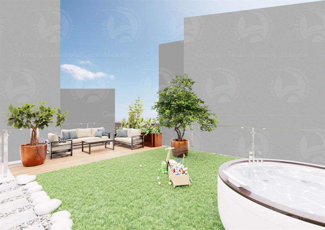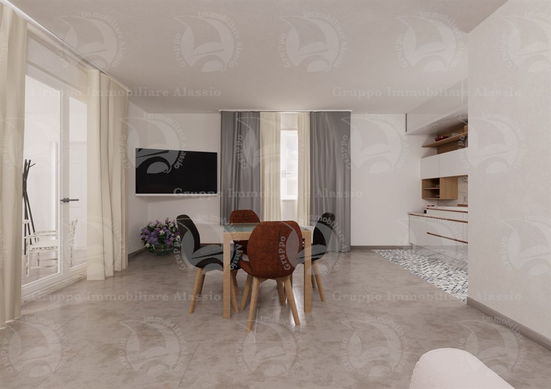 In the heart of Alassio, 100 meters from the beach, in an elegant new building, we offer for rent a ground-floor apartment with a roof garden. The apartment consists of a living room with kitchenette with access to the porch, two bedrooms, bathroom with window and closet. Large hanging garden on the upper floor accessible by internal staircase. Accurate finishes are planned and finishing materials such as floors and coverings are customizable, delivery is scheduled for summer 2027. The property will be in energy class A. The images we offer you are computer renderings of how this centrally located three-room apartment could be characterized. All floors will be served by a lift and each apartment will have a convenient parking space under the house, price of the parking space €80,000