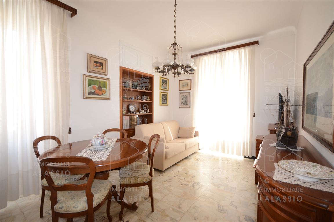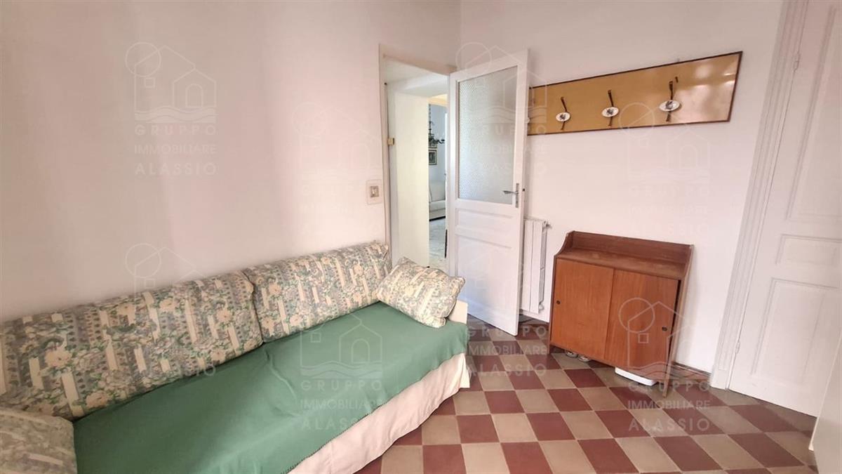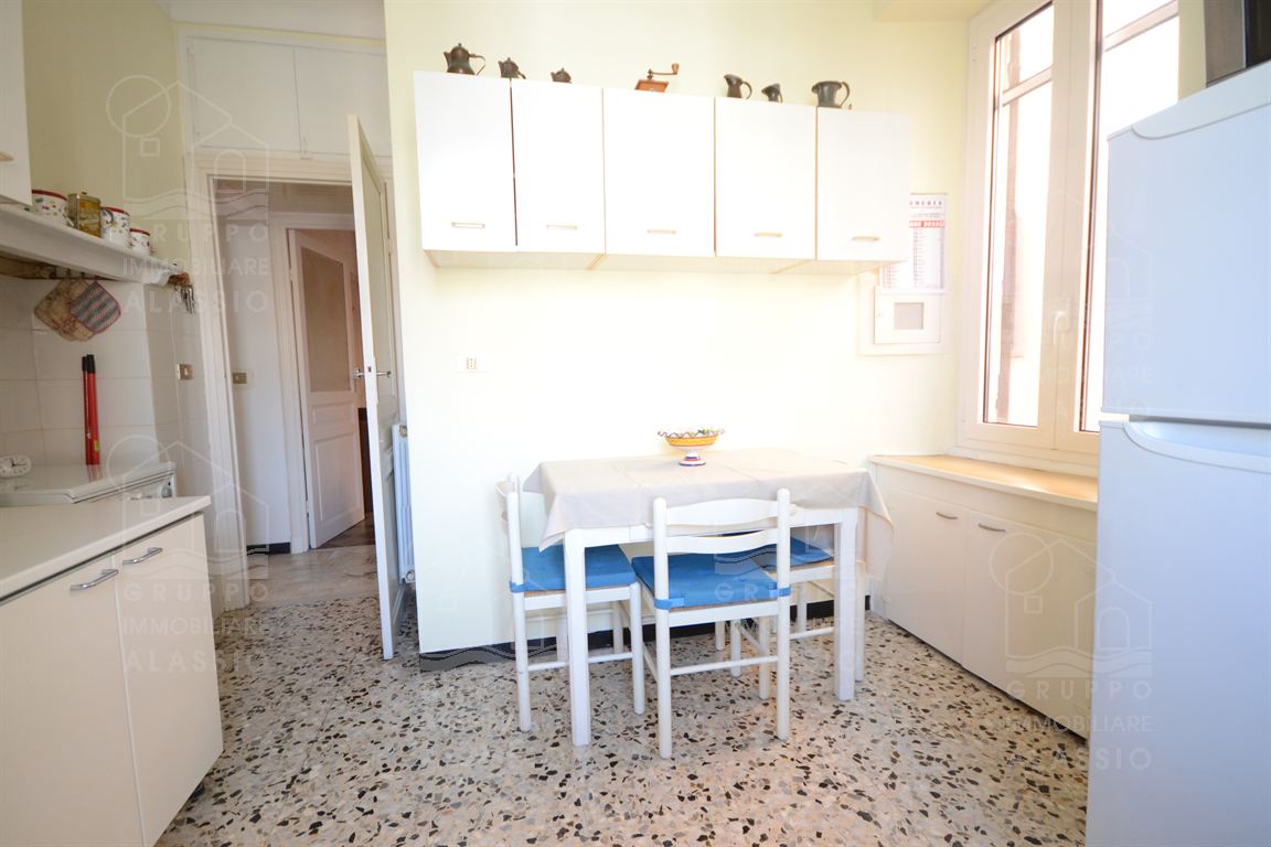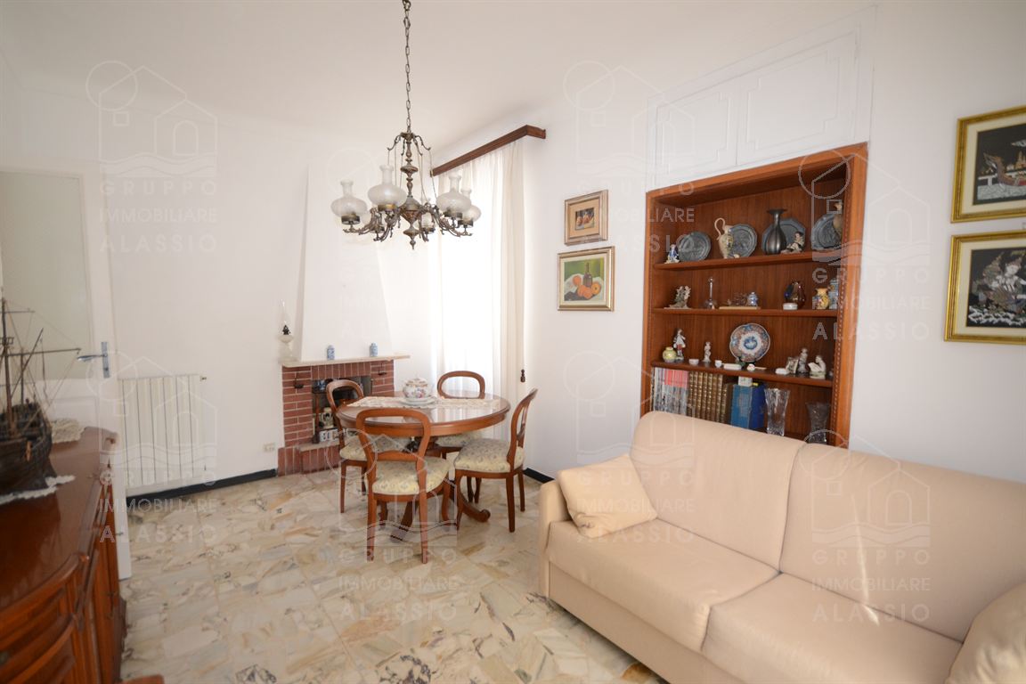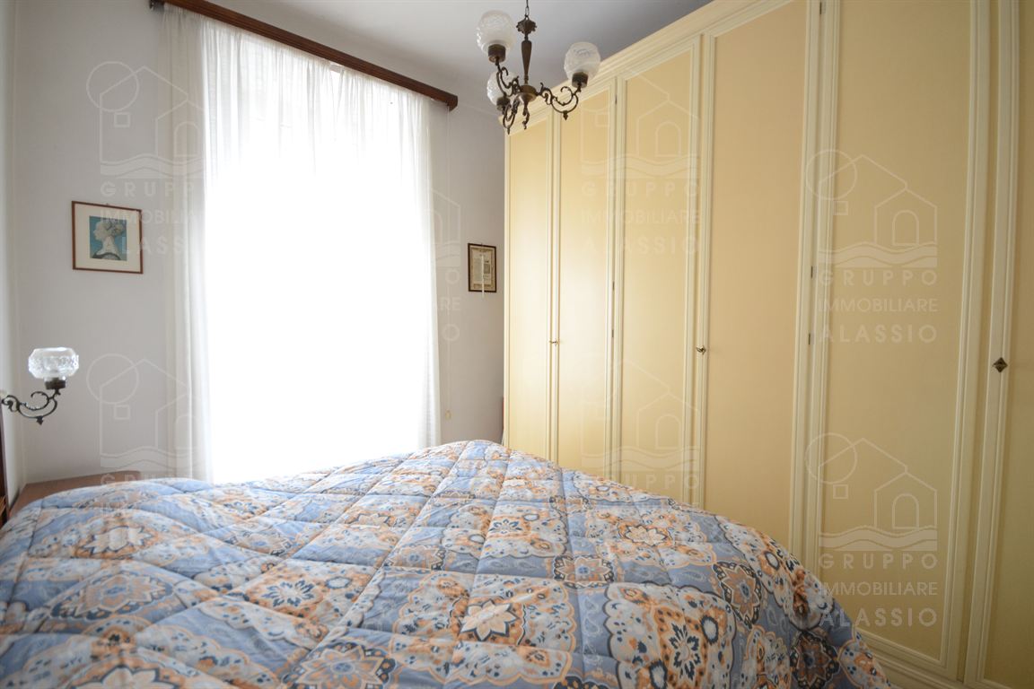 In the heart of Alassio, in a period building below Corso Dante, we are pleased to offer this pleasant and bright apartment with triple views and three balconies. Located on the second floor, the apartment comprises: entrance hall, living room with double windows and balcony, kitchen with double windows and balcony, bedroom with balcony, second bedroom with frescoed ceiling, bathroom with window. The house presents itself with the original characteristics of the house, in good condition of conservation. The electrical system and bathroom need to be overhauled. A few steps from the building, the property includes a brick warehouse measuring approximately 1.5 x 3.5 meters with a window, perfect for storing bicycles and motorcycles, plus approximately 10 m2 of outdoor space. Independent heating, low condominium fees. Condominium parking area with unassigned spaces.