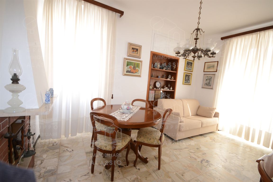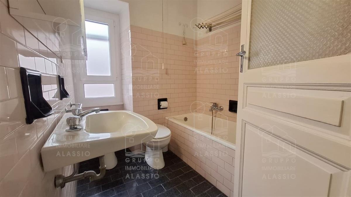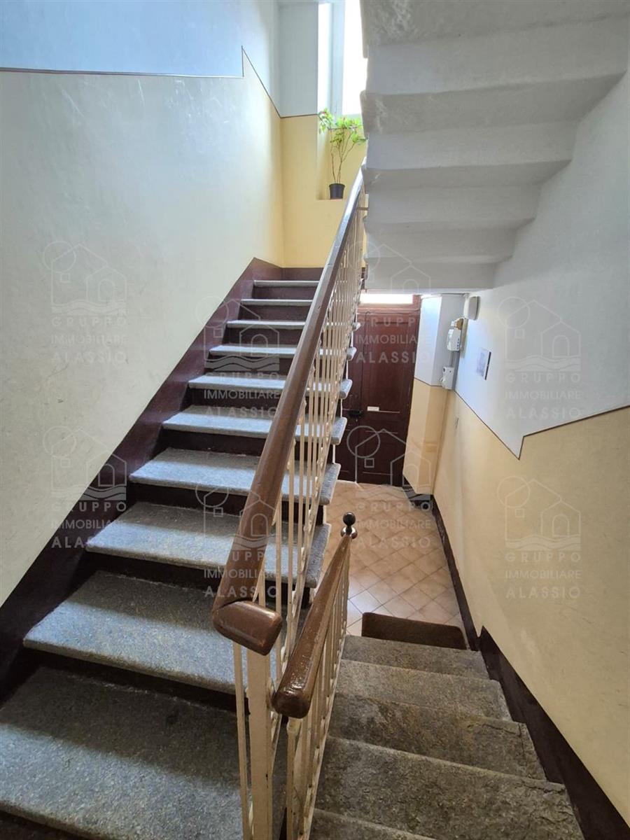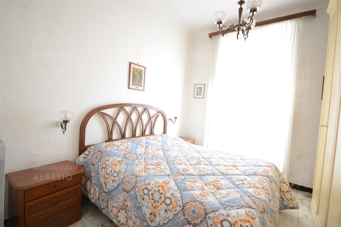 In the heart of Alassio, in a period building below Corso Dante, we are pleased to offer this pleasant and bright apartment with triple views and three balconies. Located on the second floor, the apartment comprises: entrance hall, living room with double windows and balcony, kitchen with double windows and balcony, bedroom with balcony, second bedroom with frescoed ceiling, bathroom with window. The house presents itself with the original characteristics of the house, in good condition of conservation. The electrical system and bathroom need to be overhauled. A few steps from the building, the property includes a brick warehouse measuring approximately 1.5 x 3.5 meters with a window, perfect for storing bicycles and motorcycles, plus approximately 10 m2 of outdoor space. Independent heating, low condominium fees. Condominium parking area with unassigned spaces.
