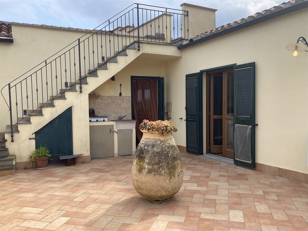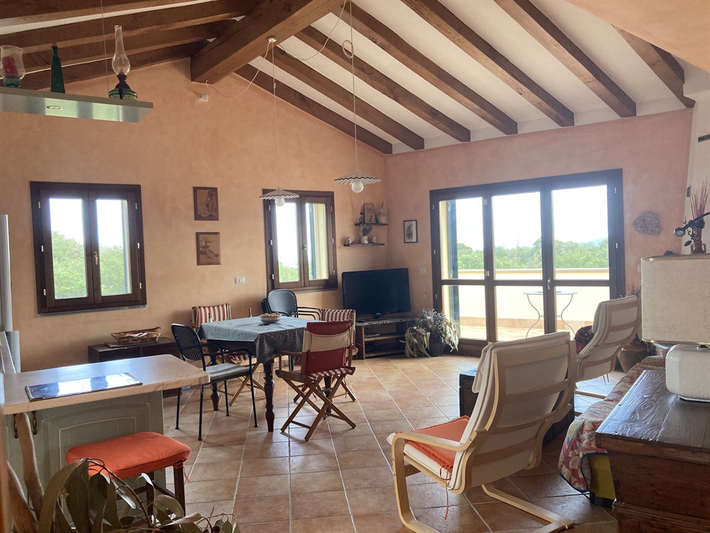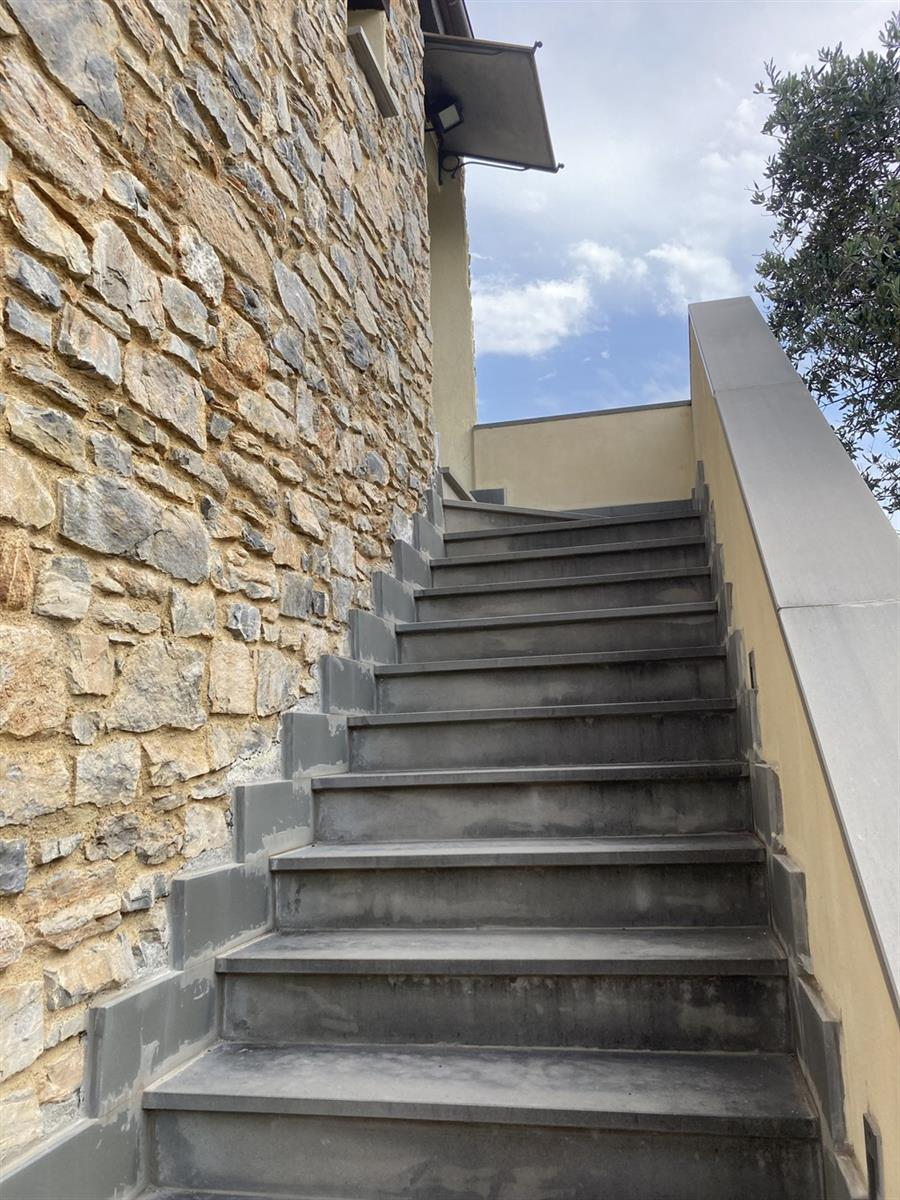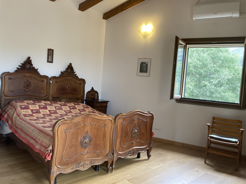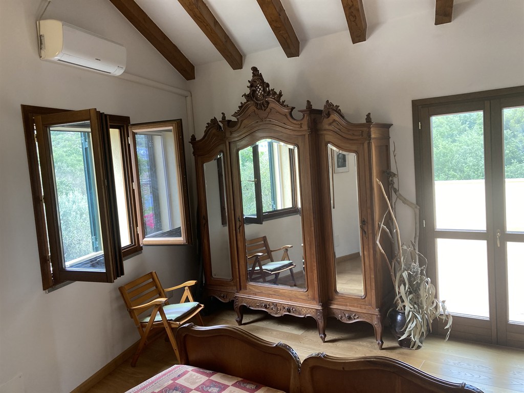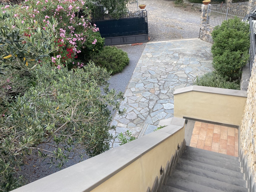 Albenga - Campochiesa: 3 km from the city center, we offer this stunning villa accommodation consisting of just three residential units. The result of a skillful renovation of an old farmhouse, it is now a bright and well-equipped property with independent entrances, private gardens, parking spaces, and a large garage. The accommodation, located on the first and top floor of this original stone building, comprises an entrance hallway, a large living room with an open-plan kitchen and fireplace, two bedrooms, and two bathrooms, both with windows. The living area leads to two large terraces, one of which features an outdoor kitchen; a third terrace offering wonderful panoramic views is accessible via an external staircase. The roof is made of exposed laminated wood beams with suitable insulation. Local stone is used extensively on the terrace balustrades. The windows are insulated with double glazing and feature thermal insulation. The property is climate-controlled with underfloor heating, a condensing boiler, and air conditioning. The property also includes a pleasant landscaped garden, a parking space, and a large garage of approximately 35 square meters.