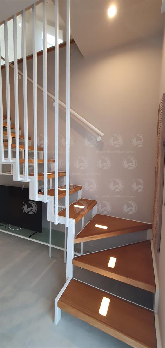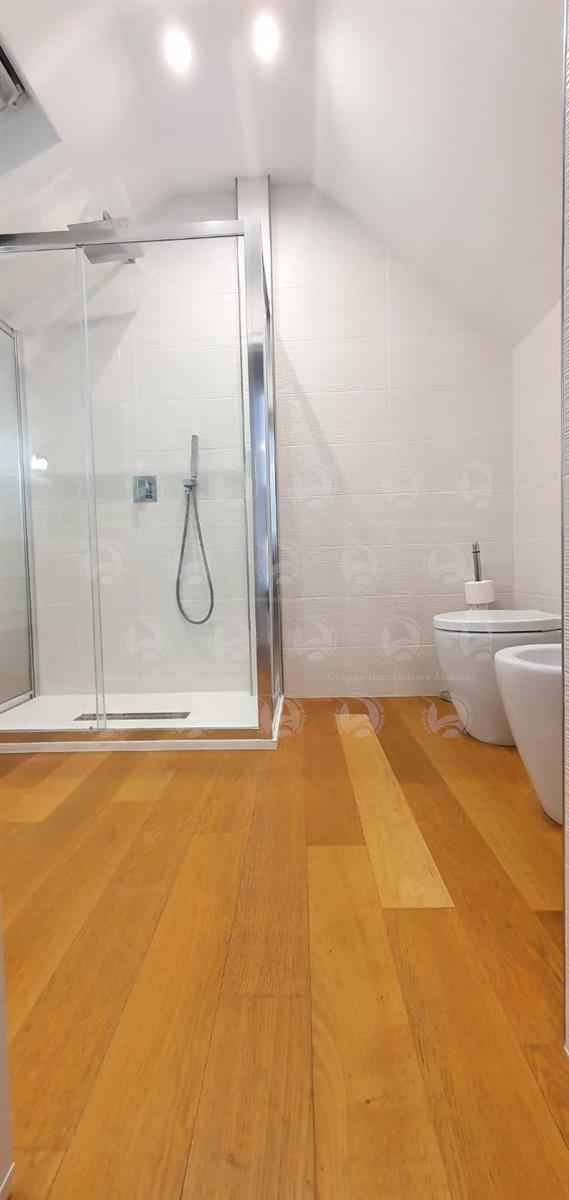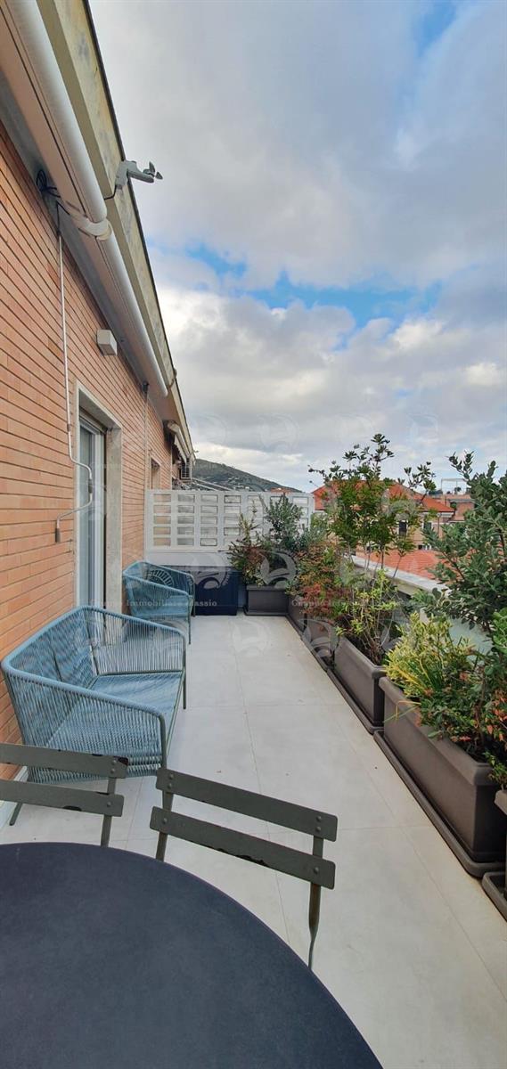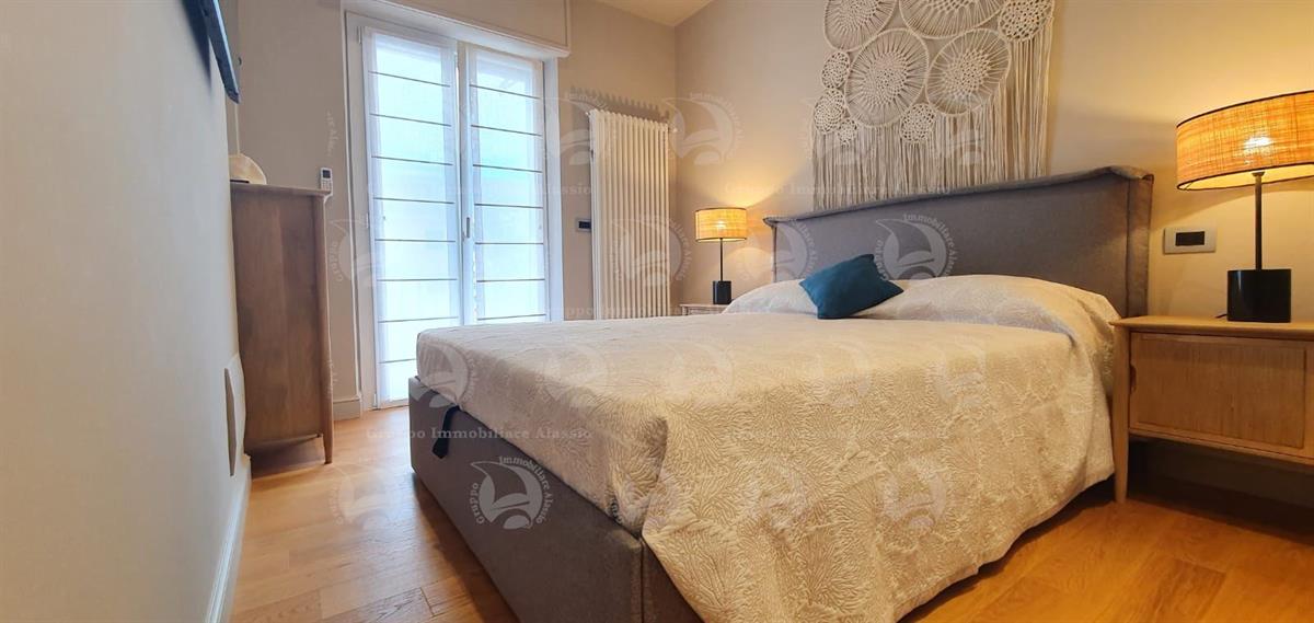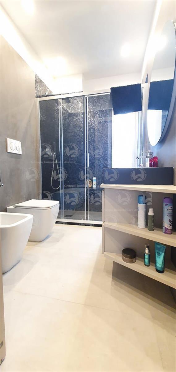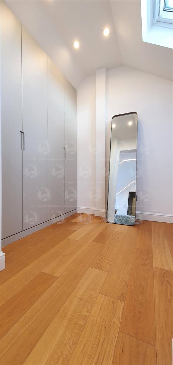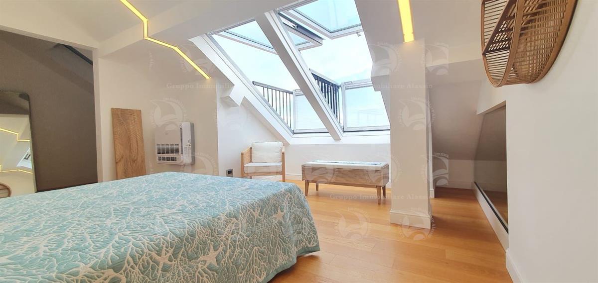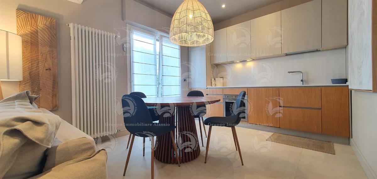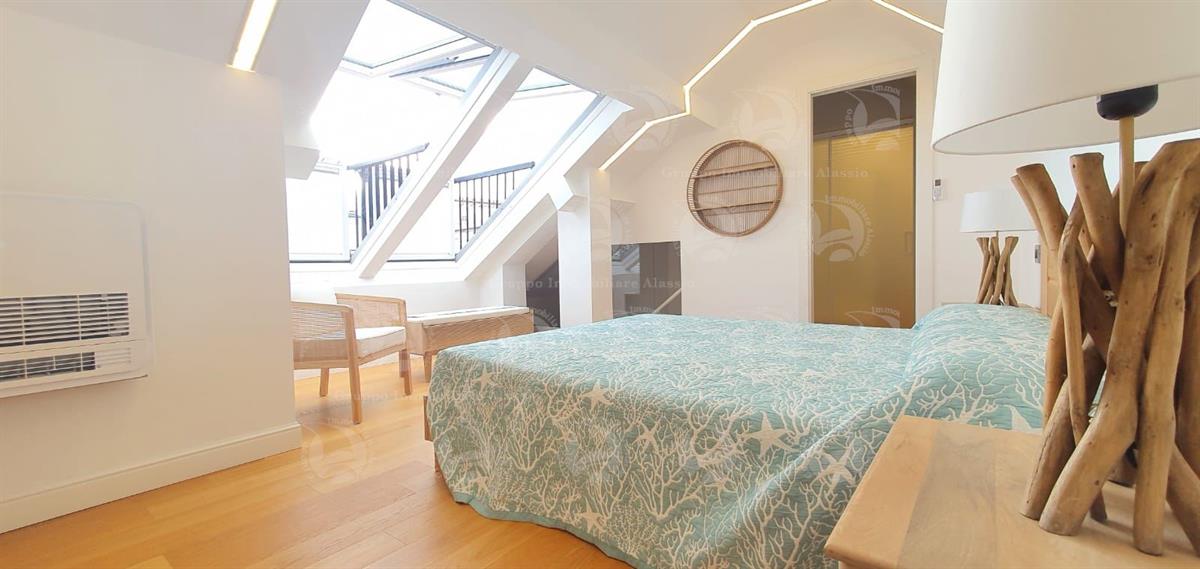 Alassio, Via Dante, in a central location just steps from the sea, we offer a two-level apartment. The property has been recently renovated with high-quality materials and comprises an entrance hall, a living room with kitchenette and large terrace, a double bedroom with balcony, and a bathroom with window. The second level features a large bedroom with walk-in closet and a bathroom. The apartment is located on the top floor of a building with an elevator. Asking price: €820,000.