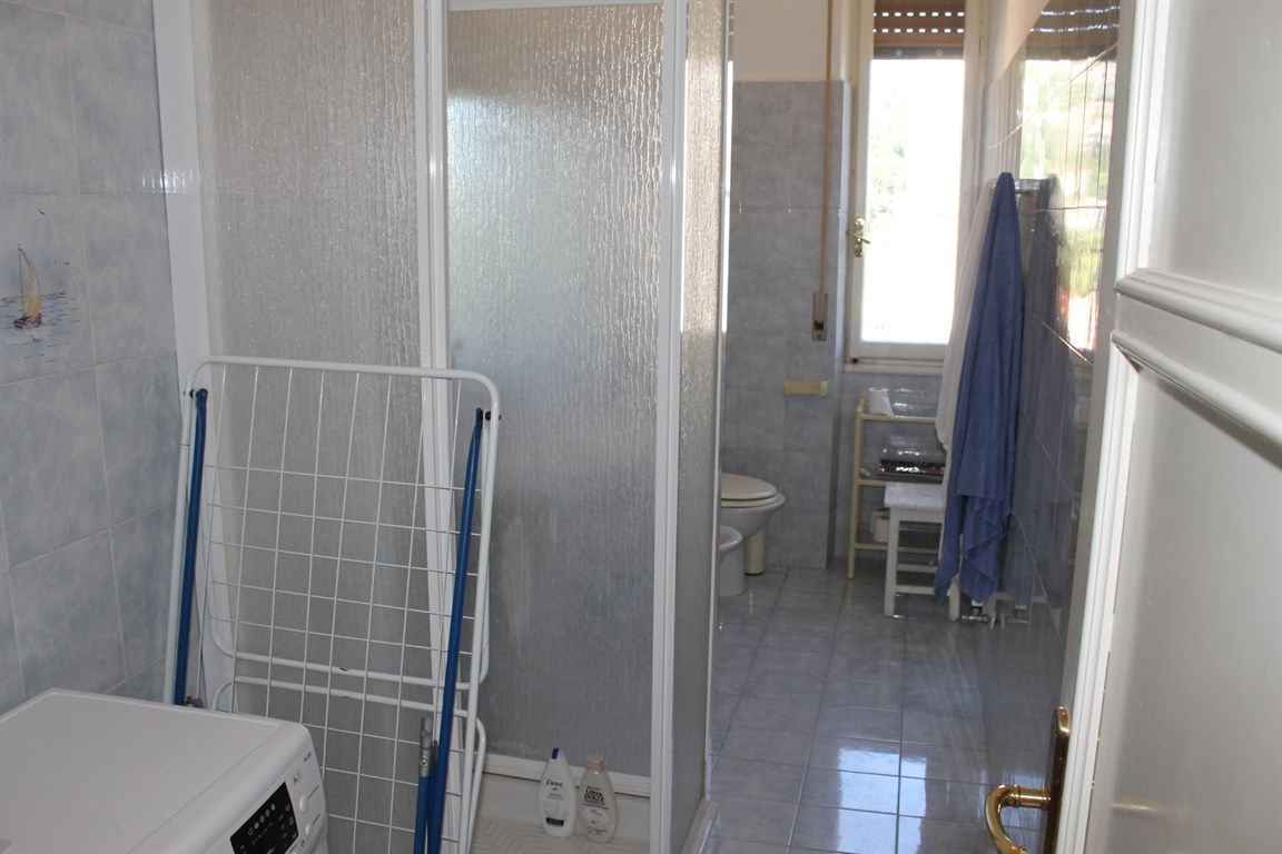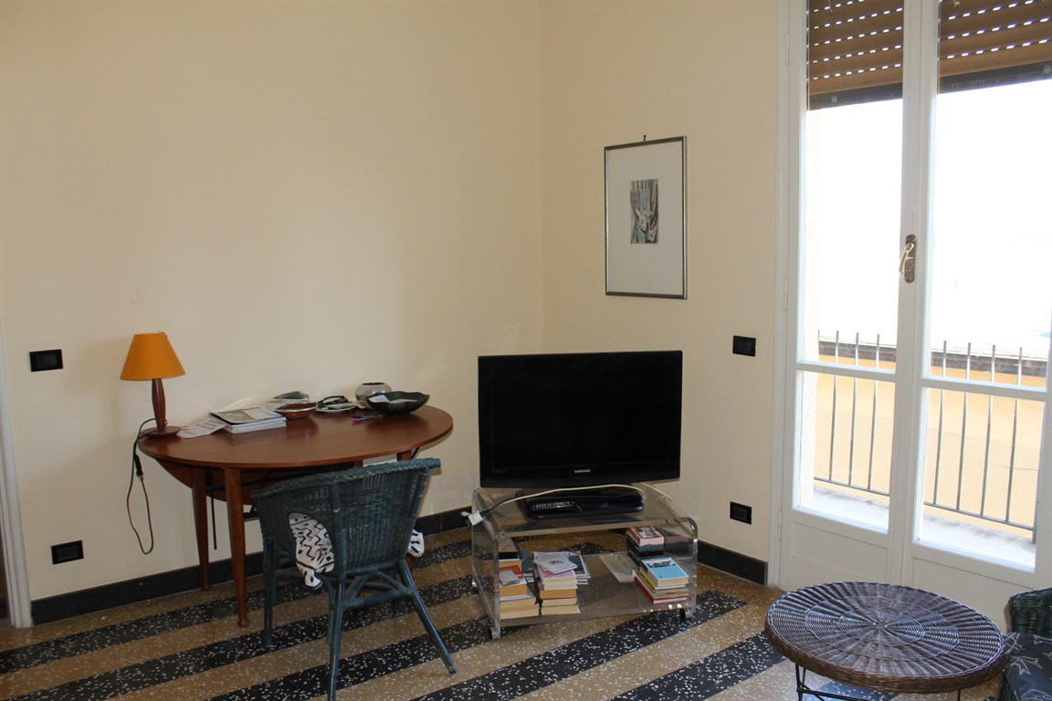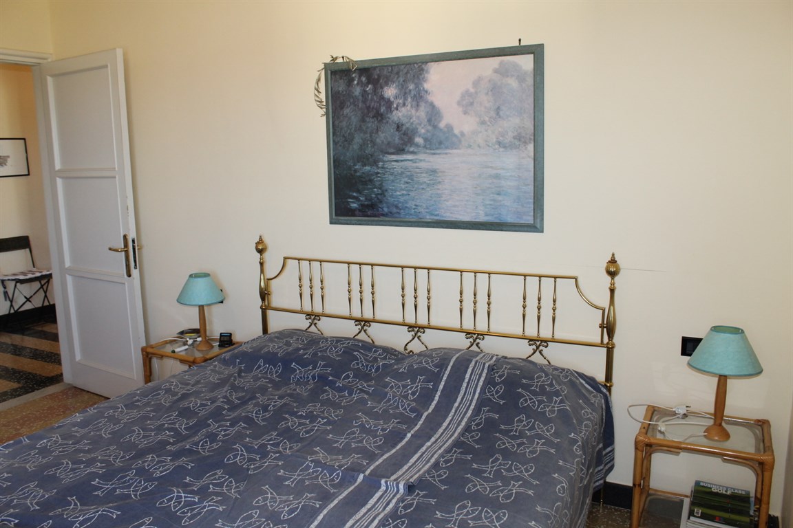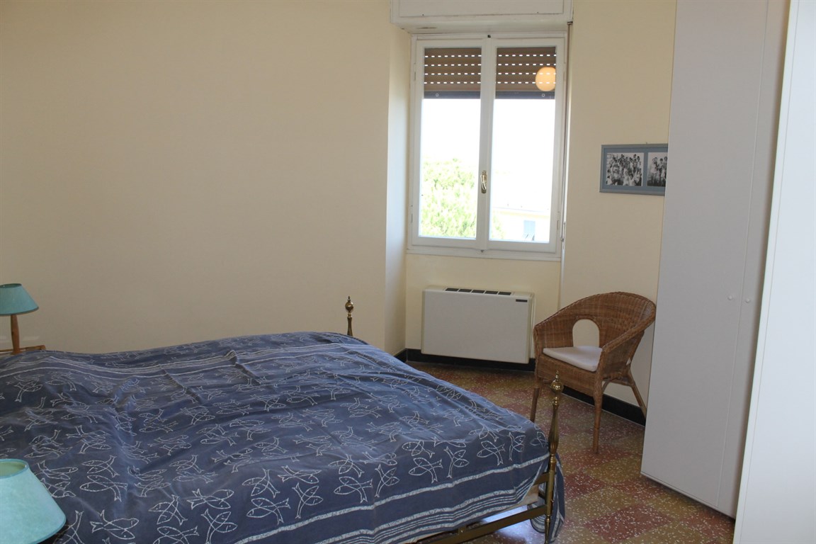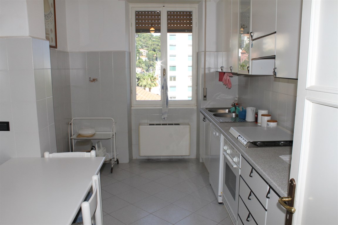 Alassio Borgo Coscia, in an elegant top-floor building with elevator, spacious apartment in good condition, comprising an entrance hall, living room, kitchen, two bedrooms, two bathrooms, storage room, and balcony. Independent heating and two private parking spaces nearby.