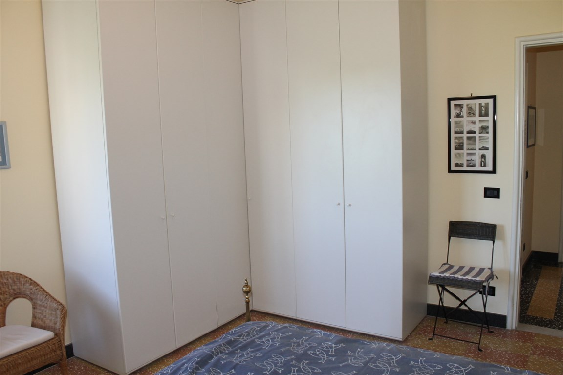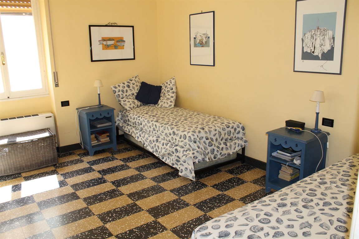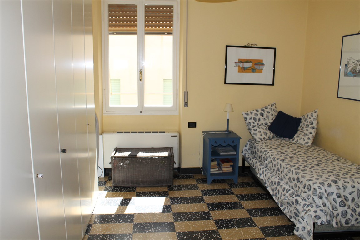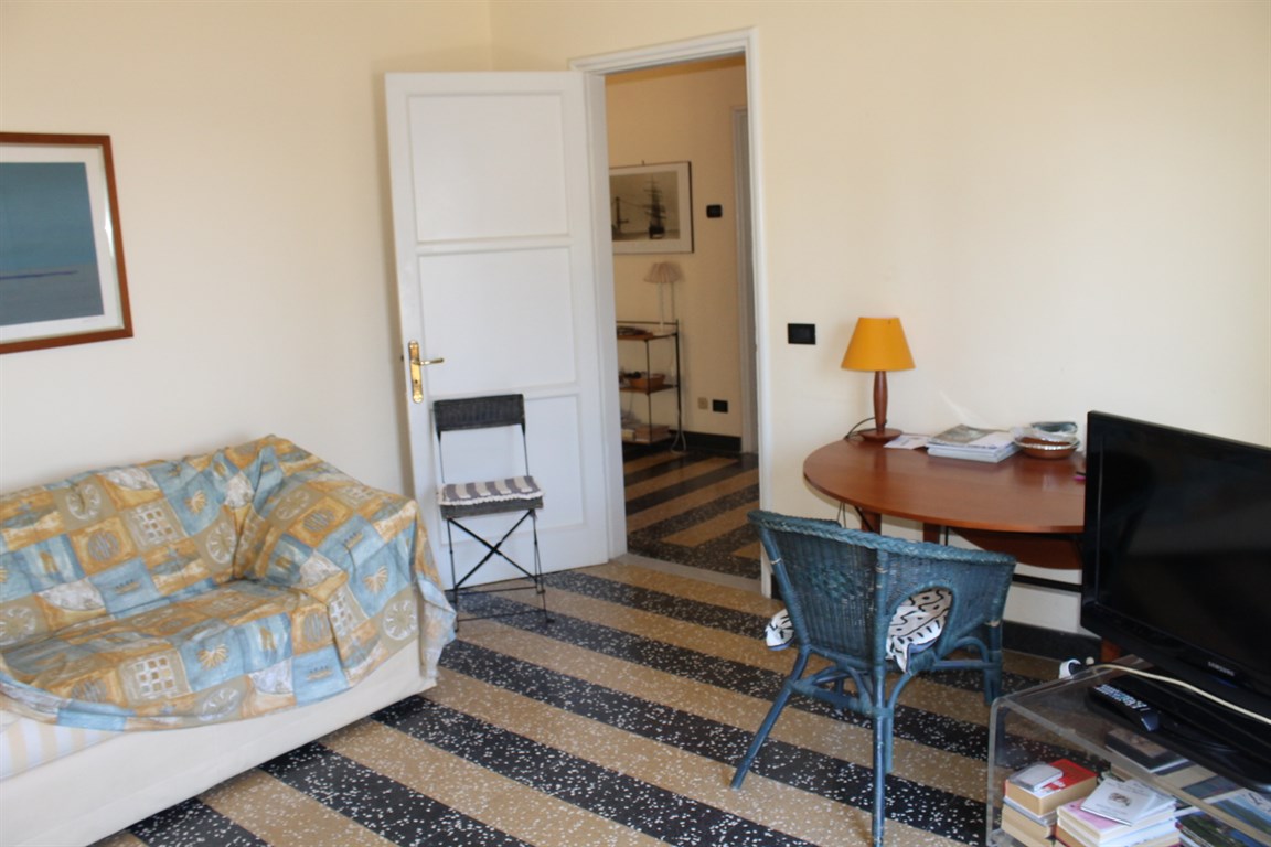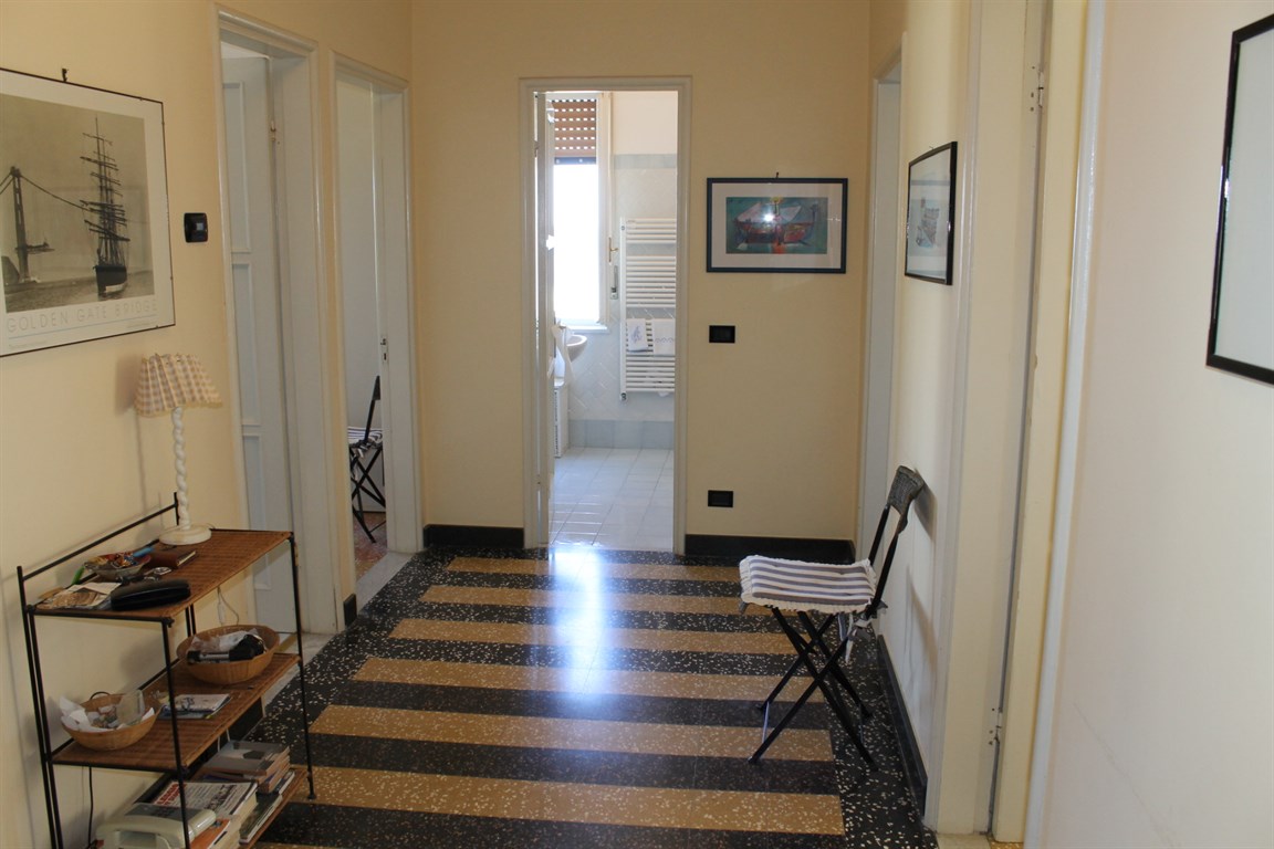 Alassio Borgo Coscia, in an elegant top-floor building with elevator, spacious apartment in good condition, comprising an entrance hall, living room, kitchen, two bedrooms, two bathrooms, storage room, and balcony. Independent heating and two private parking spaces nearby.
