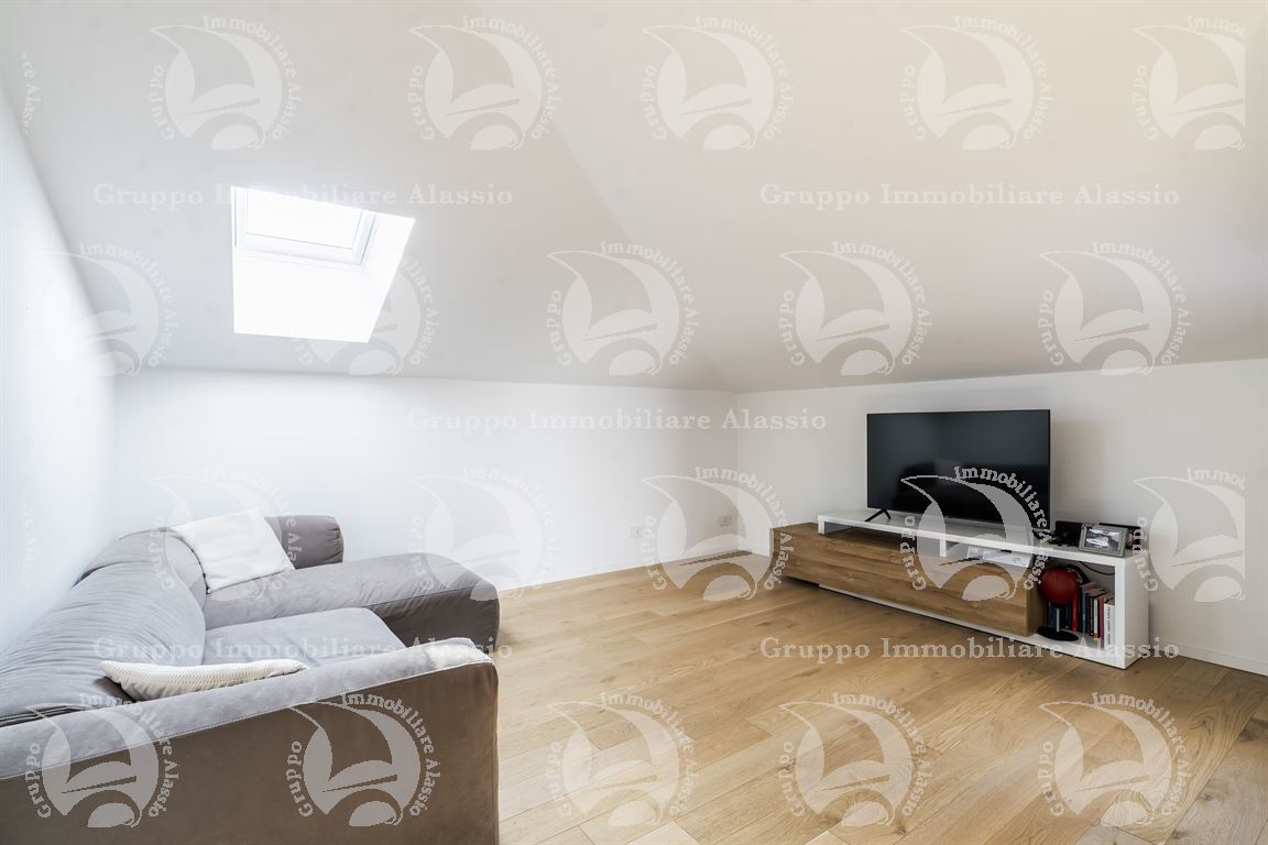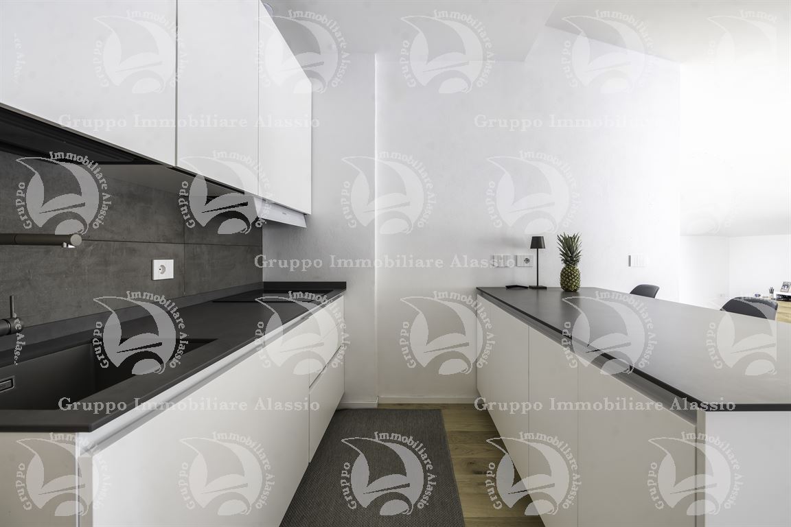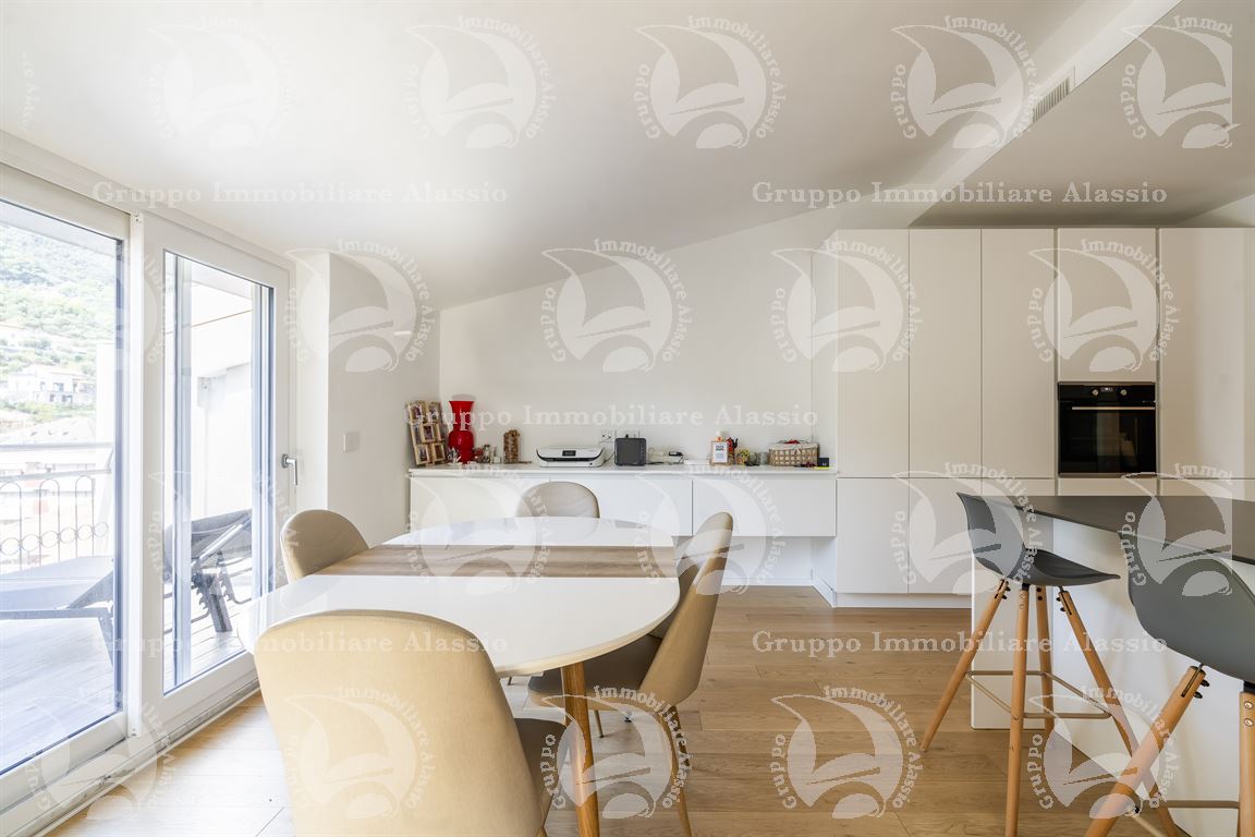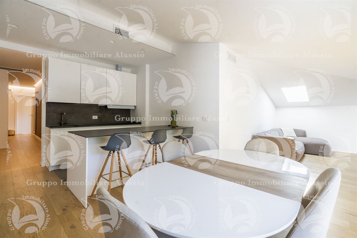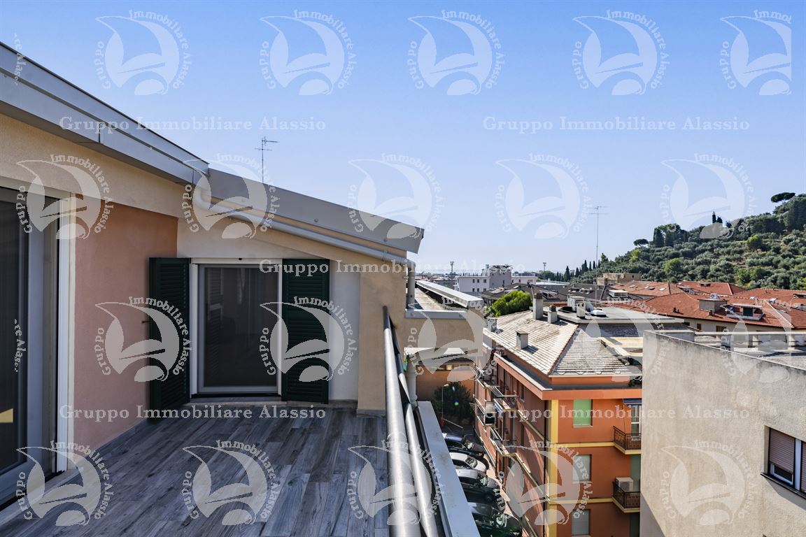 Discover this splendid penthouse located in an extremely quiet residential area, less than 400 meters from the heart of the city. Situated on the top floor of a building completely renovated in 2020, the building features an elevator and parking. Measuring approximately 150 square meters, the apartment is meticulously and elegantly finished, offering a welcoming and refined atmosphere. The penthouse is fully furnished with custom-made furniture and features parquet floors that blend harmoniously with the porcelain tile finishes in the bathrooms. The Daikin ducted air conditioning system and LED lighting ensure comfort and energy efficiency. The spacious entrance hall leads to a spectacular, well-designed and bright living room with open views and a glimpse of the sea. The property features three spacious bedrooms, two bathrooms, both with windows, a laundry room, and a storage room. The two livable terraces offer ideal spaces for relaxing outdoors. Suitable as a second home or primary residence, this home represents a unique opportunity for those seeking comfort and style in a prime location. Don't miss the opportunity to live in an exclusive and convenient setting!