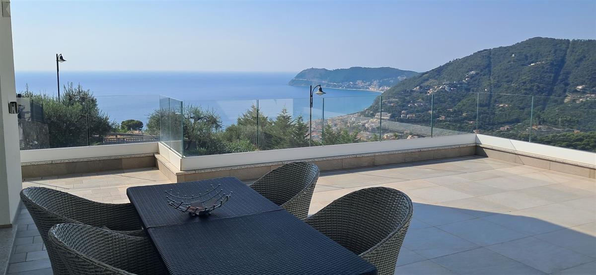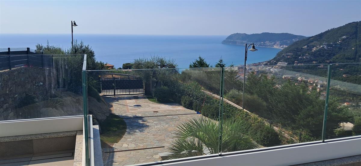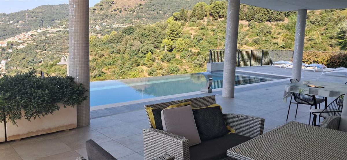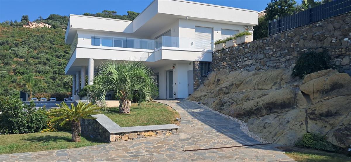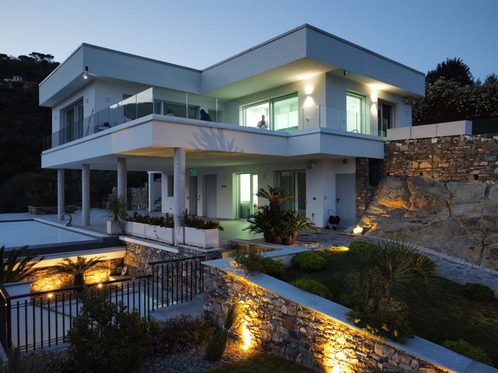 On the beautiful hillside of Alassio, we offer a modern, newly built villa with stunning sea views and a swimming pool. The villa has an interior surface area of approximately 200 square meters and is spread over two levels, which can be made independent of one another. The large terraces, spacious garden, pool area, and surrounding land of approximately 7 hectares frame this splendid villa, just 10 minutes from the center by car or scooter. The large windows offer beautiful views even from inside the home; the spacious, bright living room enjoys sea views from the sofa, as does the kitchen. Four bedrooms, four bathrooms, another kitchenette, and a smaller living room complete the layout. A spacious garage on the ground floor is internally connected to the property. Several outdoor parking spaces add to the convenience of the property. The villa has a photovoltaic system, which significantly reduces operating costs. The pool area is truly spectacular, thanks to its layout and open views. The villa is located in a very sunny spot.
