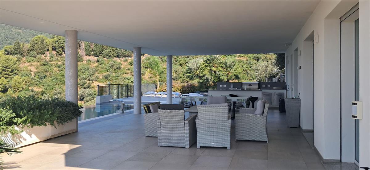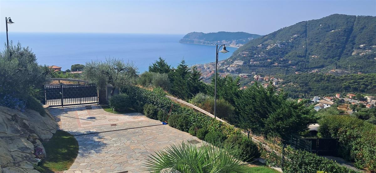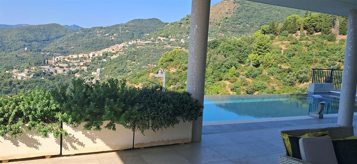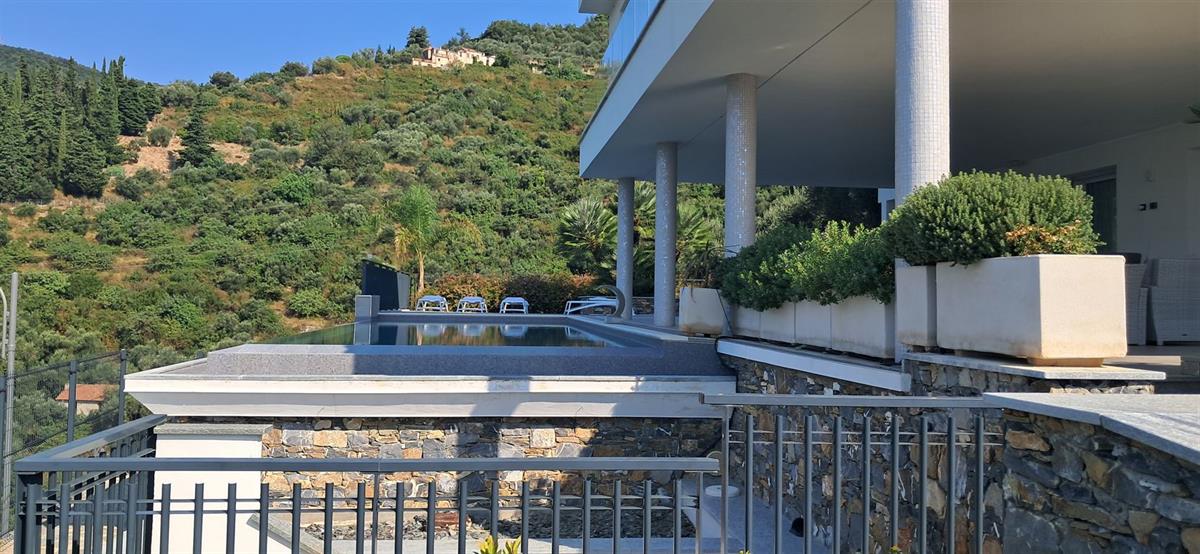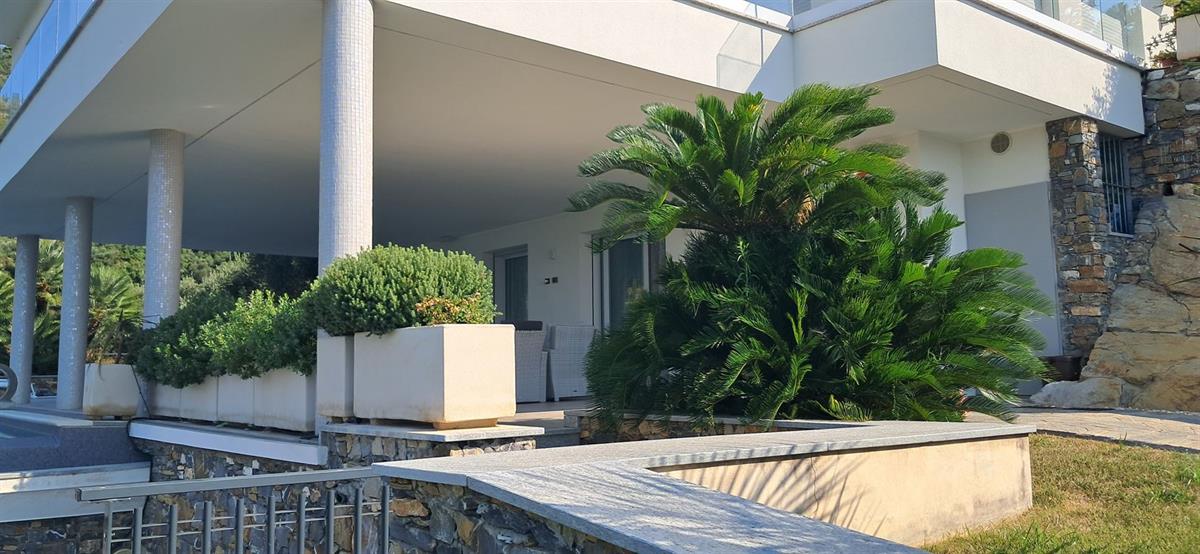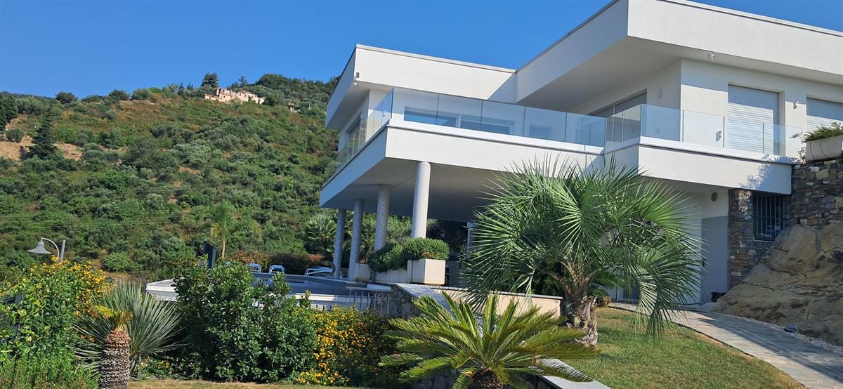 On the beautiful hillside of Alassio, we offer a modern, newly built villa with stunning sea views and a swimming pool. The villa has an interior surface area of approximately 200 square meters and is spread over two levels, which can be made independent of one another. The large terraces, spacious garden, pool area, and surrounding land of approximately 7 hectares frame this splendid villa, just 10 minutes from the center by car or scooter. The large windows offer beautiful views even from inside the home; the spacious, bright living room enjoys sea views from the sofa, as does the kitchen. Four bedrooms, four bathrooms, another kitchenette, and a smaller living room complete the layout. A spacious garage on the ground floor is internally connected to the property. Several outdoor parking spaces add to the convenience of the property. The villa has a photovoltaic system, which significantly reduces operating costs. The pool area is truly spectacular, thanks to its layout and open views. The villa is located in a very sunny spot.