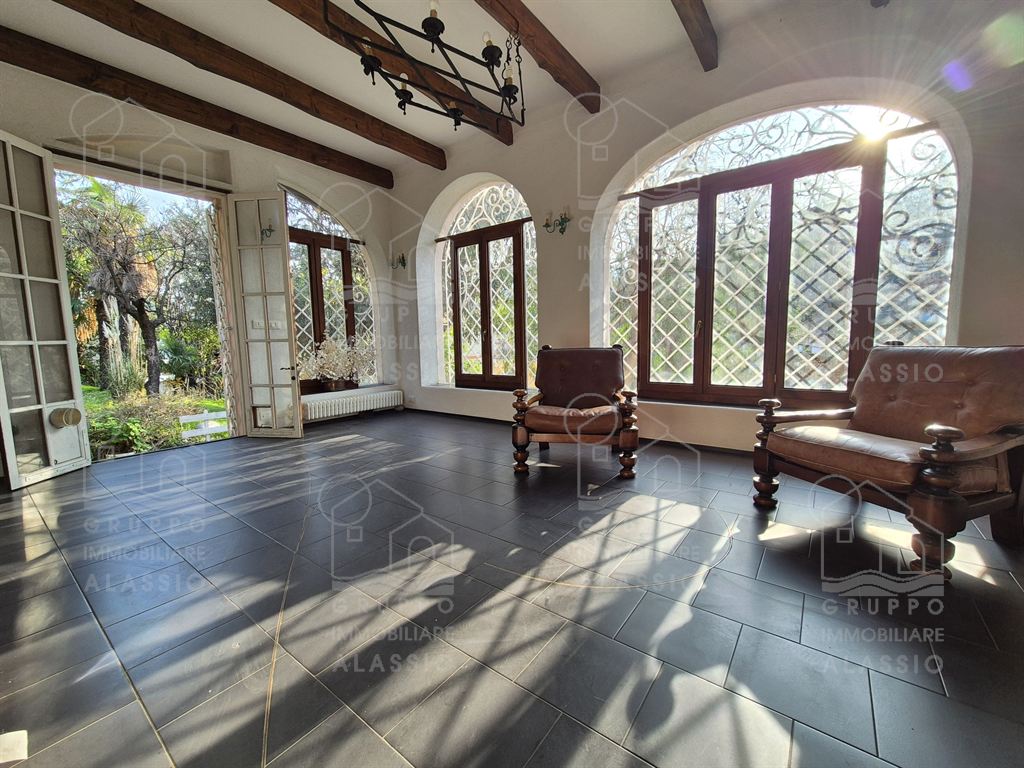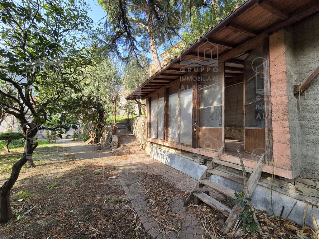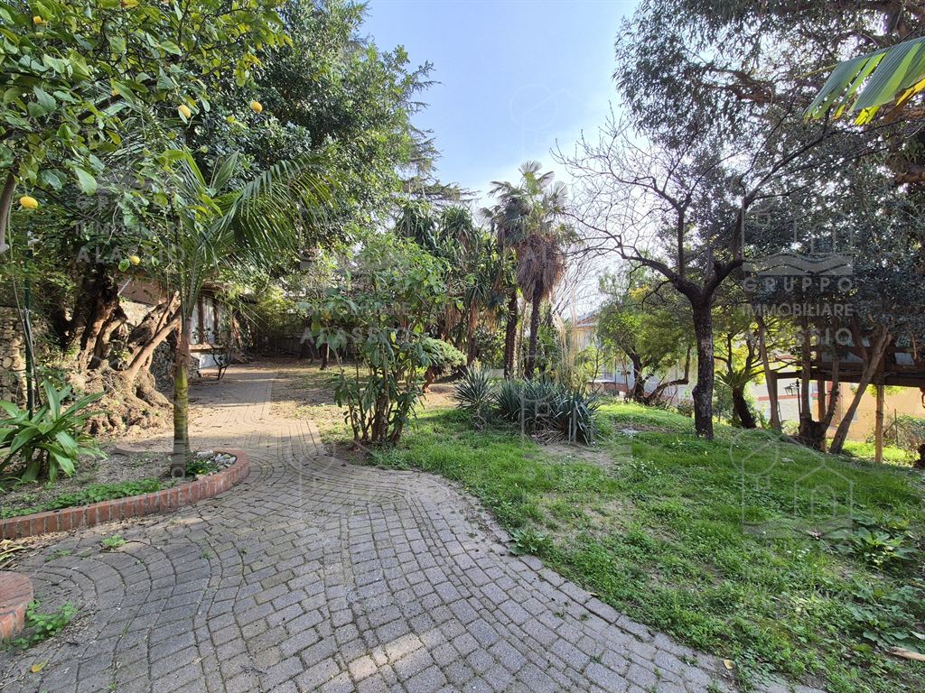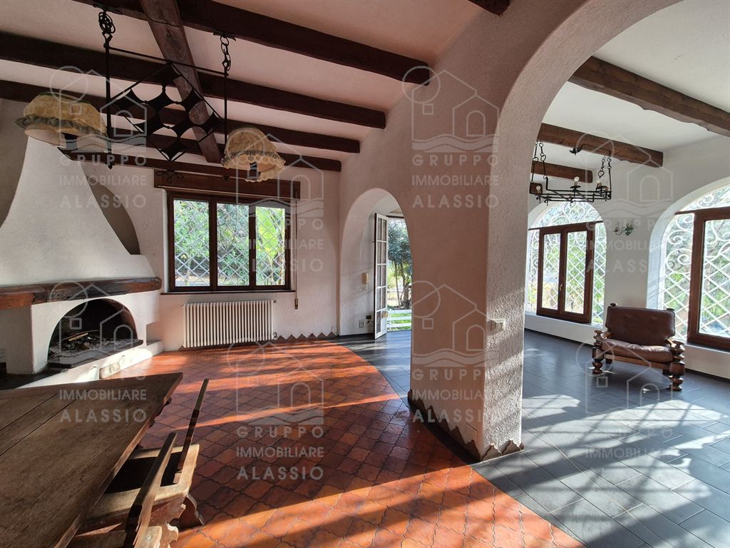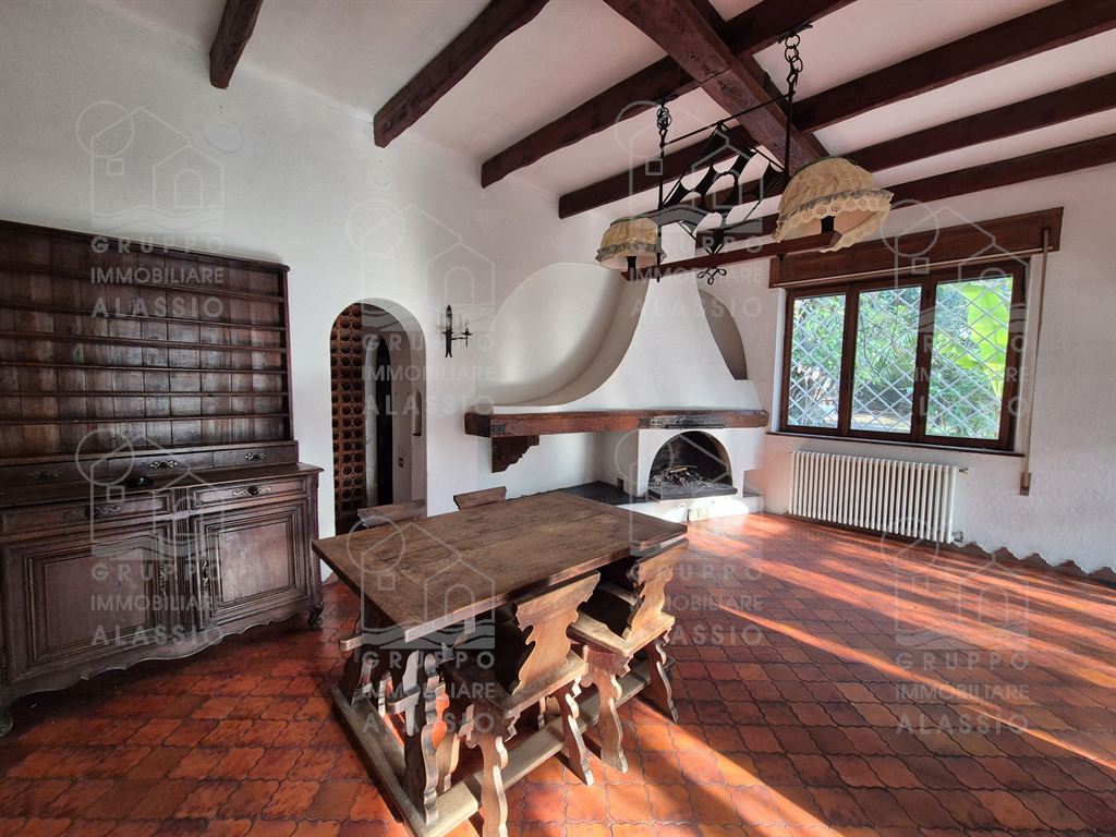 Alassio, independent portion of a villa, ground-to-sky, with private park and glimpse of sea view. Less than 1 km from the sea, in a sunny position, the villa is arranged on two large levels. On the ground floor you are greeted by a bright corner room with large windows on both sides and a direct view of the park. Beyond the living room, a large dining area with a handcrafted fireplace and the kitchen area await us. There are two double bedrooms, a bathroom with window and a large closet/pantry. The upper floor was used as if it were a separate apartment. Here, the large and bright living room with open-plan kitchen and double access to the large sunny terrace dominates. This is followed by a double bedroom and a bathroom with a large floor-level bathtub. Within the private park we also find a charming outbuilding of approximately 50 m2, in need of renovation. The park is a green space of great value, characterized by large spaces and magnificent trees. An ideal oasis for relaxing, letting children play, partying with friends, and providing essential space for our four-legged friends. Water lovers will be happy to know that there is the possibility of building a swimming pool. This exclusive residence is completed by two garages.