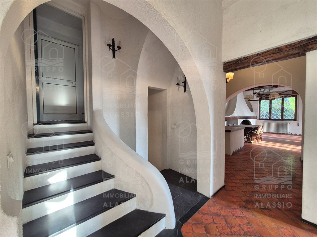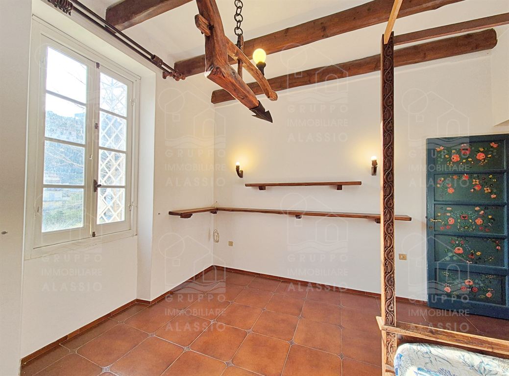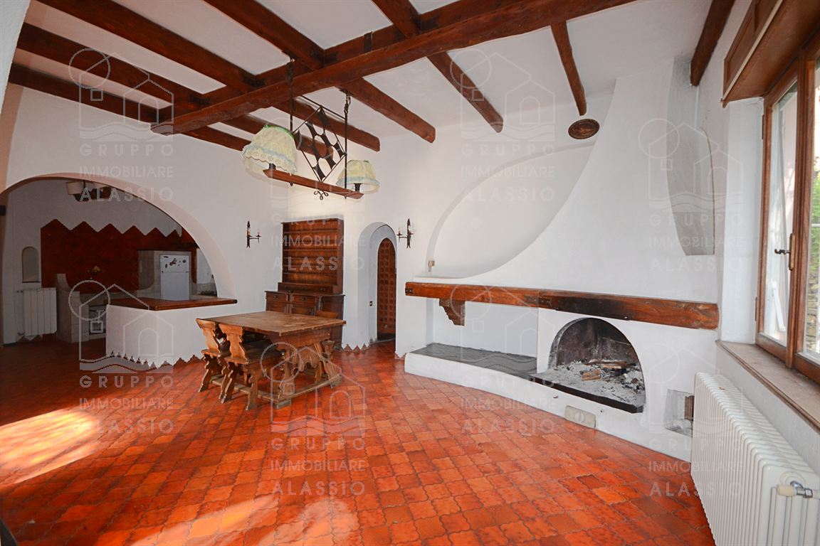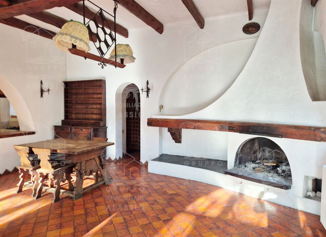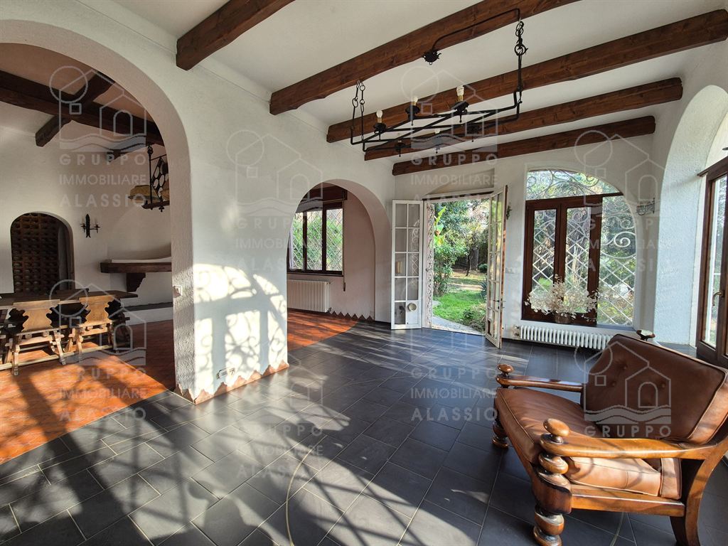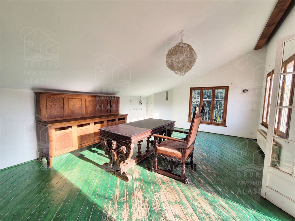 Alassio, independent portion of a villa, ground-to-sky, with private park and glimpse of sea view. Less than 1 km from the sea, in a sunny position, the villa is arranged on two large levels. On the ground floor you are greeted by a bright corner room with large windows on both sides and a direct view of the park. Beyond the living room, a large dining area with a handcrafted fireplace and the kitchen area await us. There are two double bedrooms, a bathroom with window and a large closet/pantry. The upper floor was used as if it were a separate apartment. Here, the large and bright living room with open-plan kitchen and double access to the large sunny terrace dominates. This is followed by a double bedroom and a bathroom with a large floor-level bathtub. Within the private park we also find a charming outbuilding of approximately 50 m2, in need of renovation. The park is a green space of great value, characterized by large spaces and magnificent trees. An ideal oasis for relaxing, letting children play, partying with friends, and providing essential space for our four-legged friends. Water lovers will be happy to know that there is the possibility of building a swimming pool. This exclusive residence is completed by two garages.