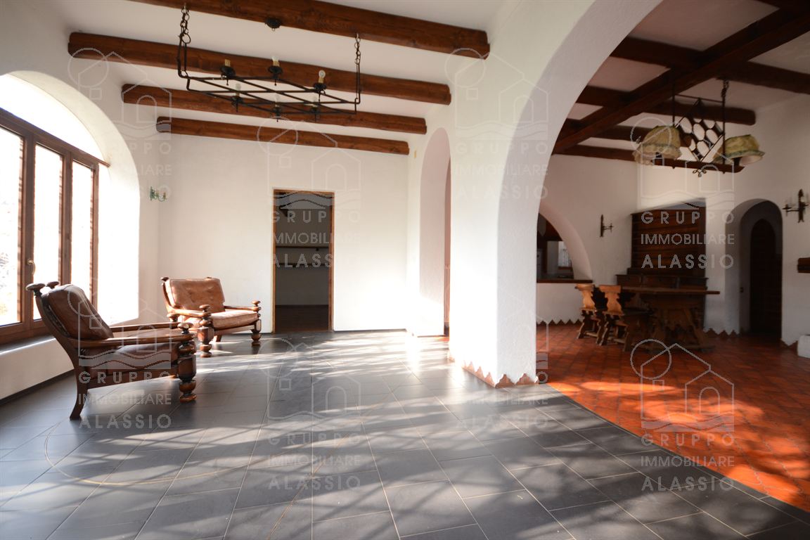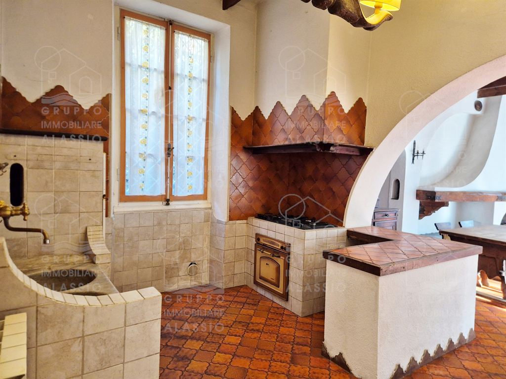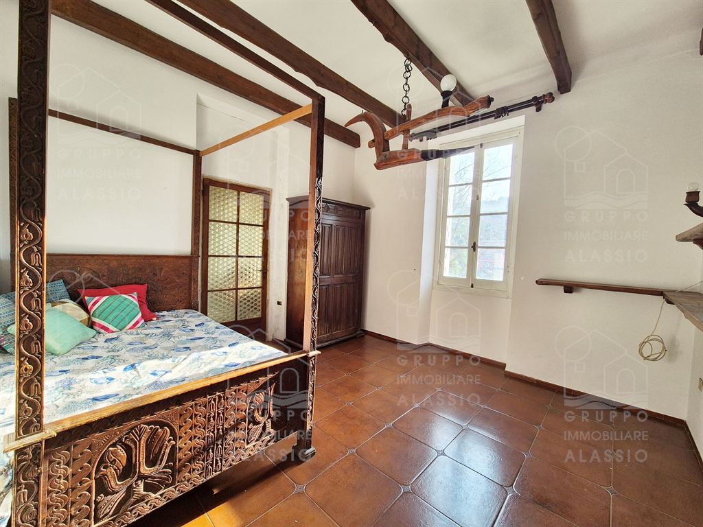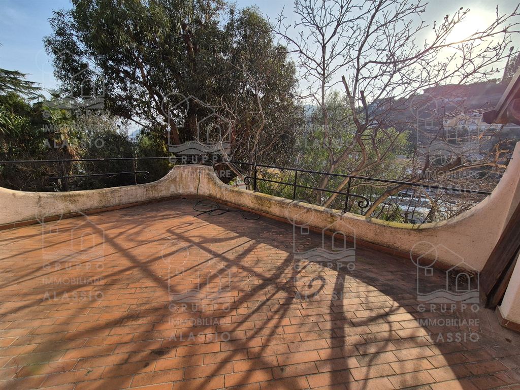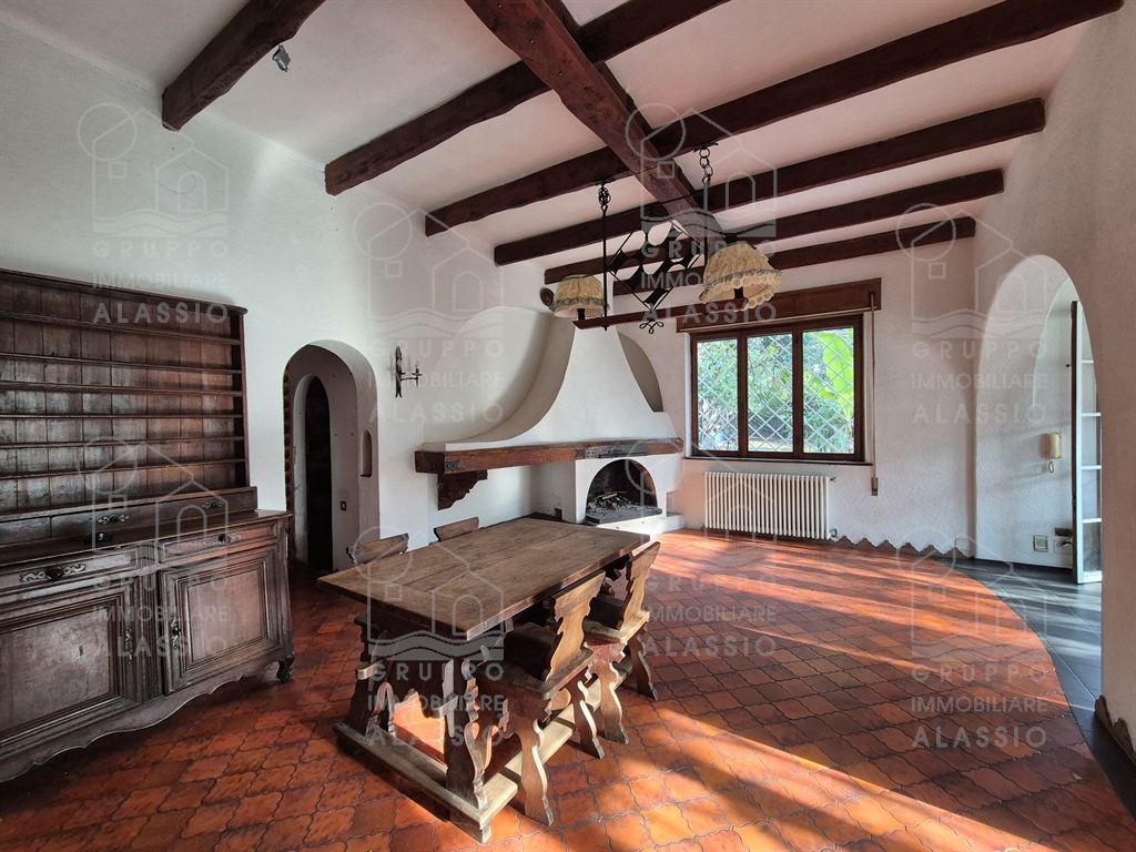 Alassio, independent portion of a villa, ground-to-sky, with private park and glimpse of sea view. Less than 1 km from the sea, in a sunny position, the villa is arranged on two large levels. On the ground floor you are greeted by a bright corner room with large windows on both sides and a direct view of the park. Beyond the living room, a large dining area with a handcrafted fireplace and the kitchen area await us. There are two double bedrooms, a bathroom with window and a large closet/pantry. The upper floor was used as if it were a separate apartment. Here, the large and bright living room with open-plan kitchen and double access to the large sunny terrace dominates. This is followed by a double bedroom and a bathroom with a large floor-level bathtub. Within the private park we also find a charming outbuilding of approximately 50 m2, in need of renovation. The park is a green space of great value, characterized by large spaces and magnificent trees. An ideal oasis for relaxing, letting children play, partying with friends, and providing essential space for our four-legged friends. Water lovers will be happy to know that there is the possibility of building a swimming pool. This exclusive residence is completed by two garages.