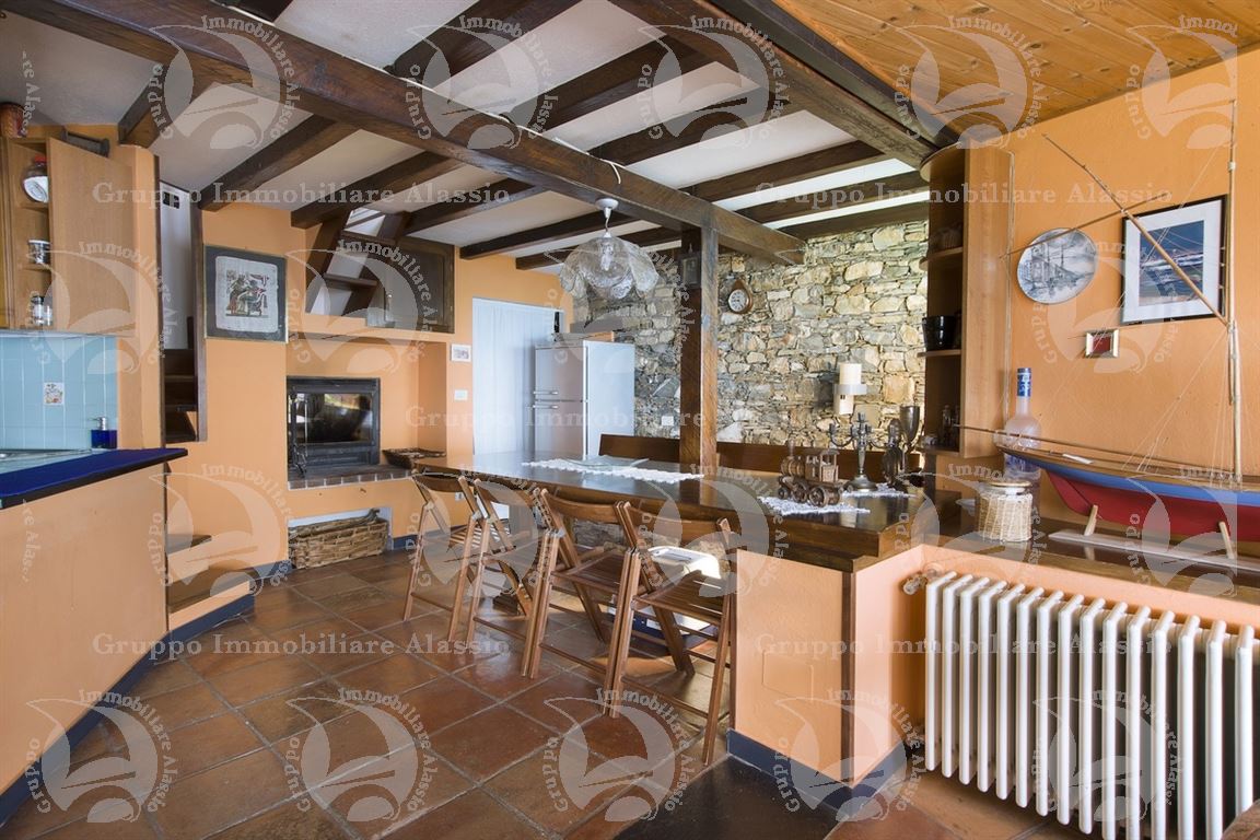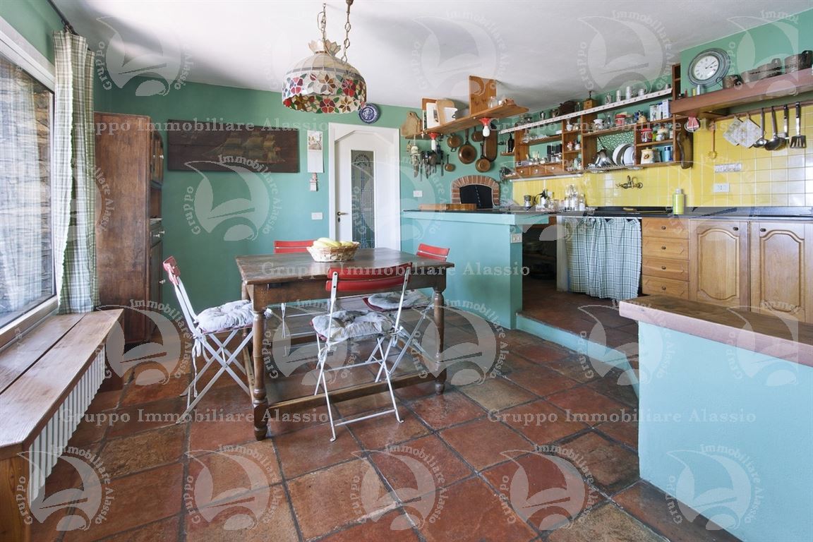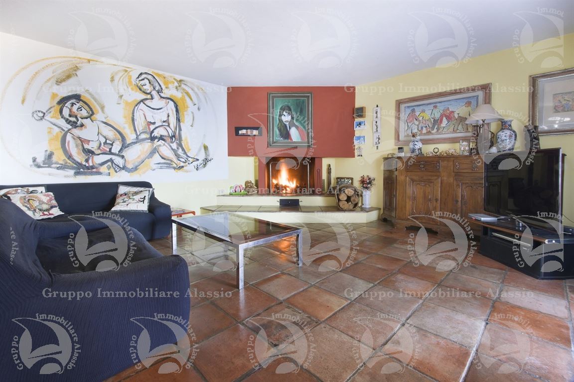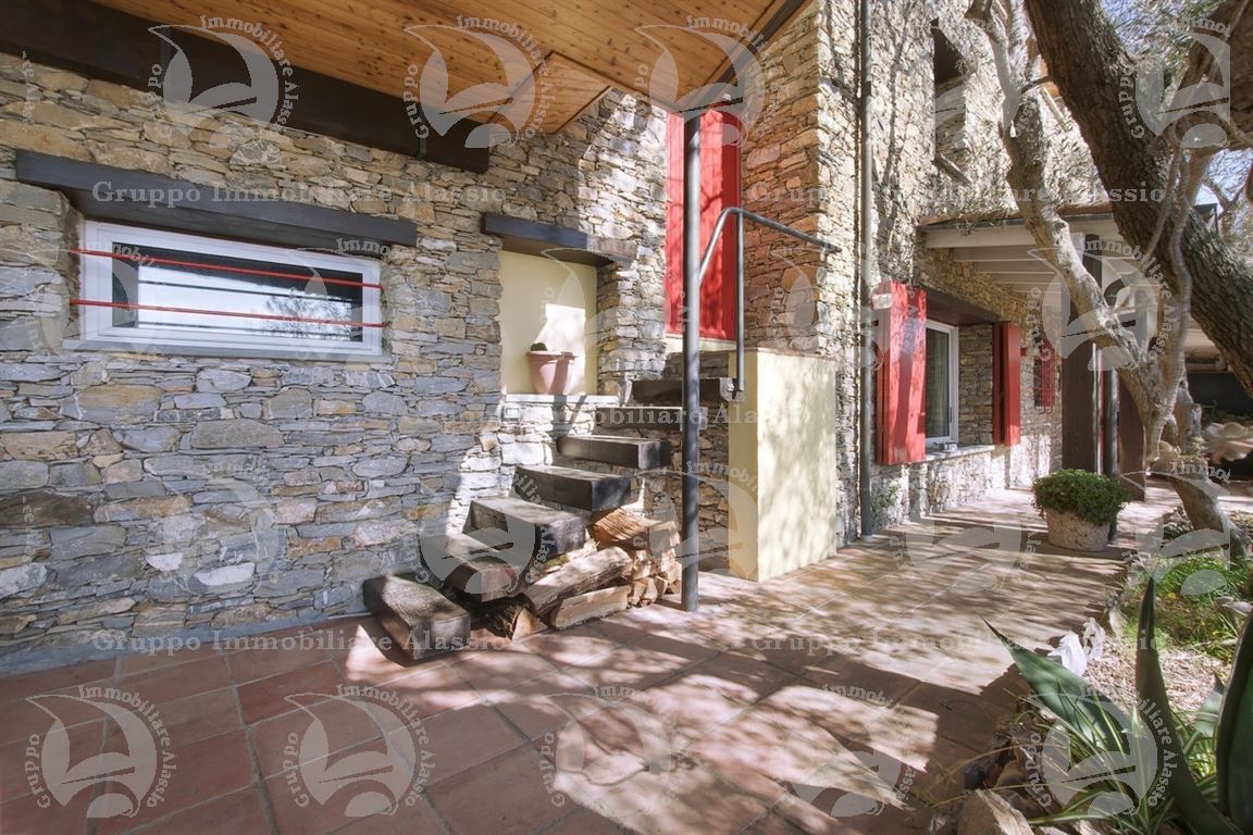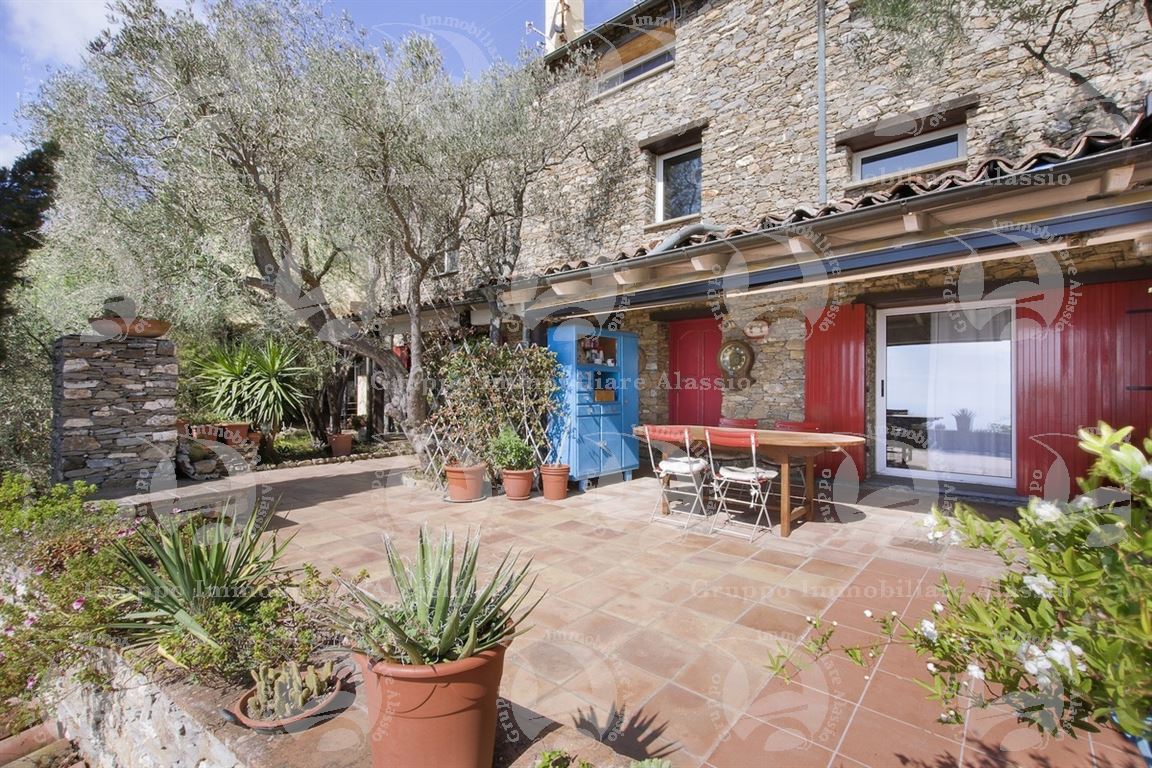 Alassio, on the hillside in the Vegliasco area, offers a multi-level villa. Originally a rustic stone building, it was completely renovated in 1981-82, preserving the original architecture and materials, primarily the exposed stone, completely chipped so that the cement used to reinforce it was not visible. Situated at 402 meters above sea level, it offers a stunning view of the Gulf of Alassio, bathed in sunlight from the early hours of the morning. From every corner of the villa, you can admire the marvelous view of the hillside stretching all the way to the sea. The doorsteps are split slate, the floors are period terracotta in the living area and solid wood in the bedrooms. The bathrooms and kitchens are tiled in Sardinian wax with double sinks and both a bathtub and shower. Three wood-burning fireplaces for romantic evenings by the fire, and a barbecue and pizza oven throughout the villa for carefree evenings with friends. The main villa measures 220 m², plus a 65 m² porch and 60 m² terrace. There is also a small 65 m² two-room apartment with a 30 m² terrace. A 50 m² basement room, plus a 30 m² terrace and a 10 m² terrace. The 600 m² plot of land is landscaped with numerous fruit and olive trees. A large cellar and a 55 m² double garage complete the property.